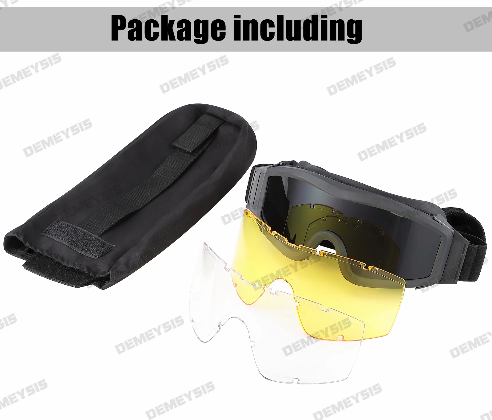 El paquete incluye: 1x gafas de seguridad con 3 lentes intercambiables 1x funda de tela 1x bolsa de transporte