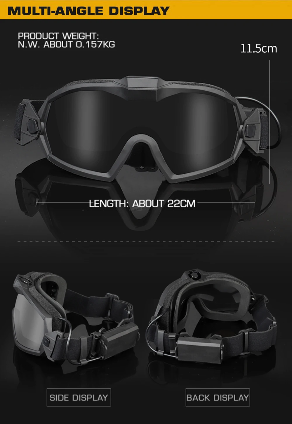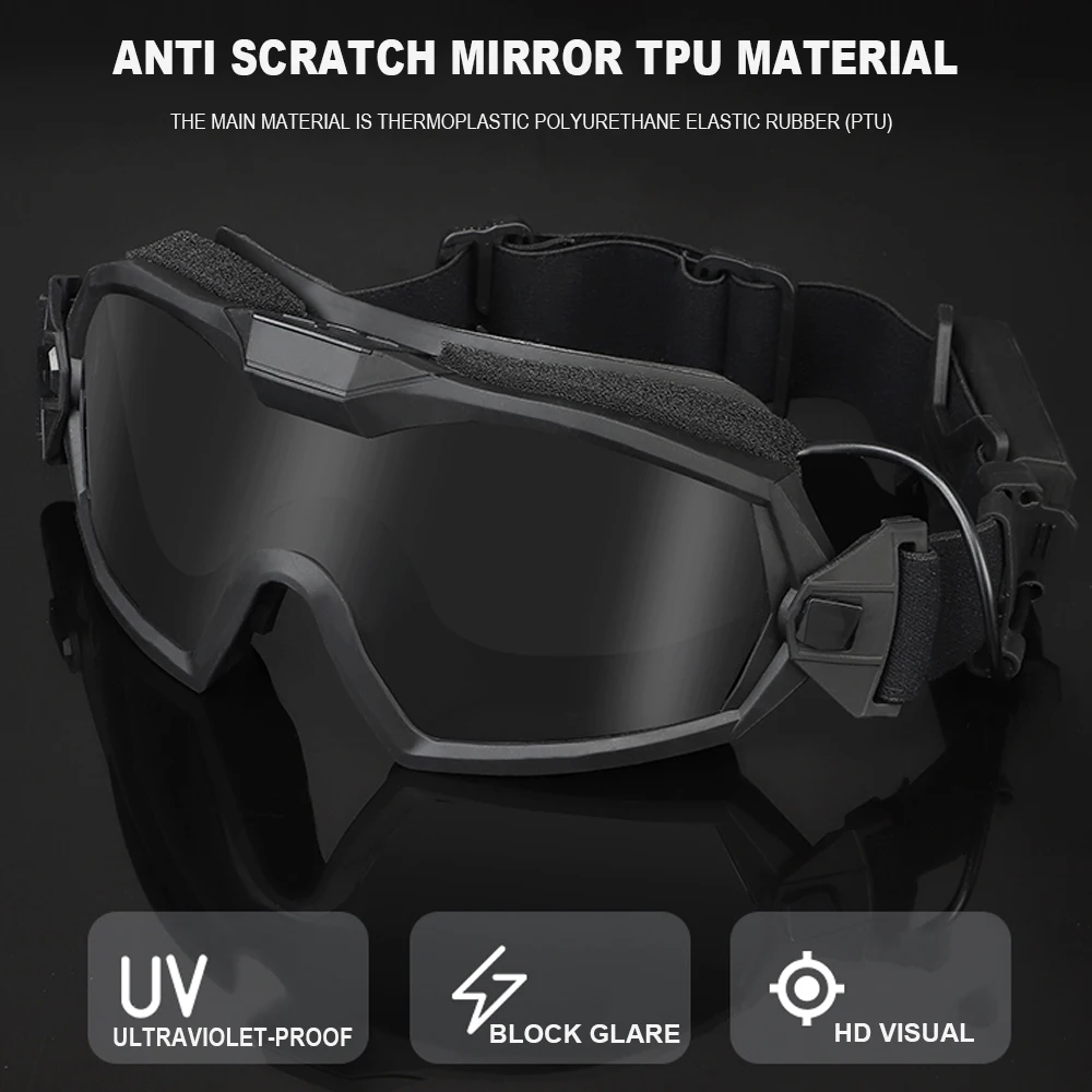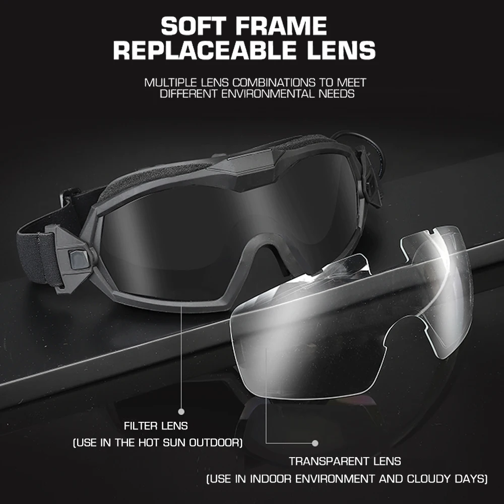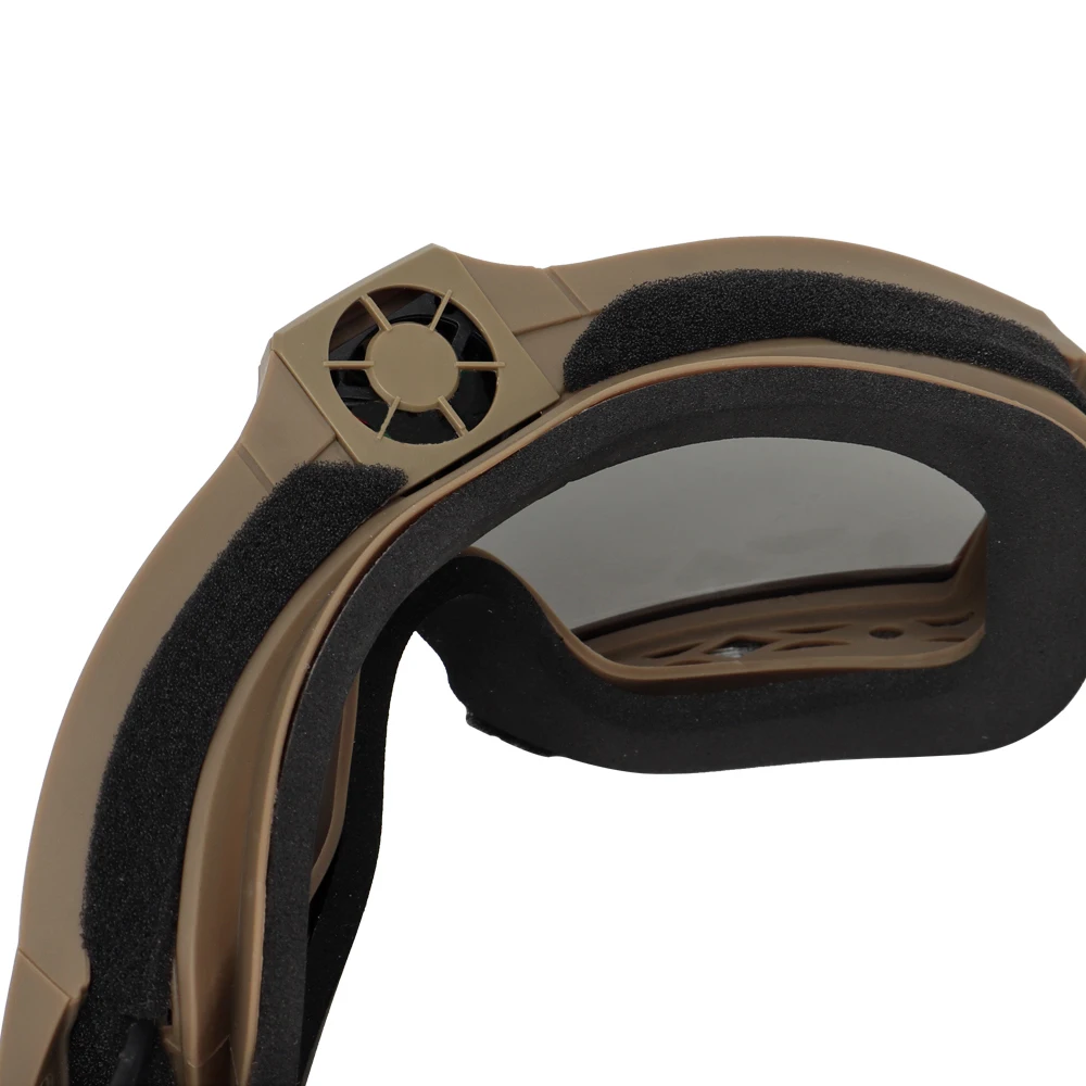 Nombre del producto: gafas tácticas antivaho. Número de artículo.:GG-MA-122 Tamaño del producto: 24*10*8cm Peso neto del producto: 0,157 kg. Peso bruto del producto: 0,259 kg. Color del producto: NEGRO, TAN Material principal: TPE, ABS Accesorios del producto: gafas principales, paño para gafas, lente transparente (negra) Escena aplicable: caza, deportes al aire libre y otros juegos tácticos Airsoft CS, etc.