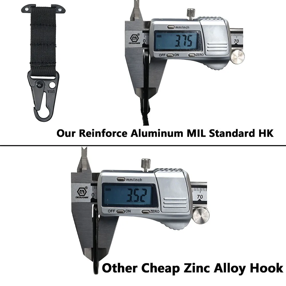 ② Gancho de choque de metal: El HK está hecho de aluminio de alta resistencia y duradero, no de aleación de zinc. El gancho de mosquetón táctico puede llevar sus guantes tácticos, llavero y equipos de caza de casco L
