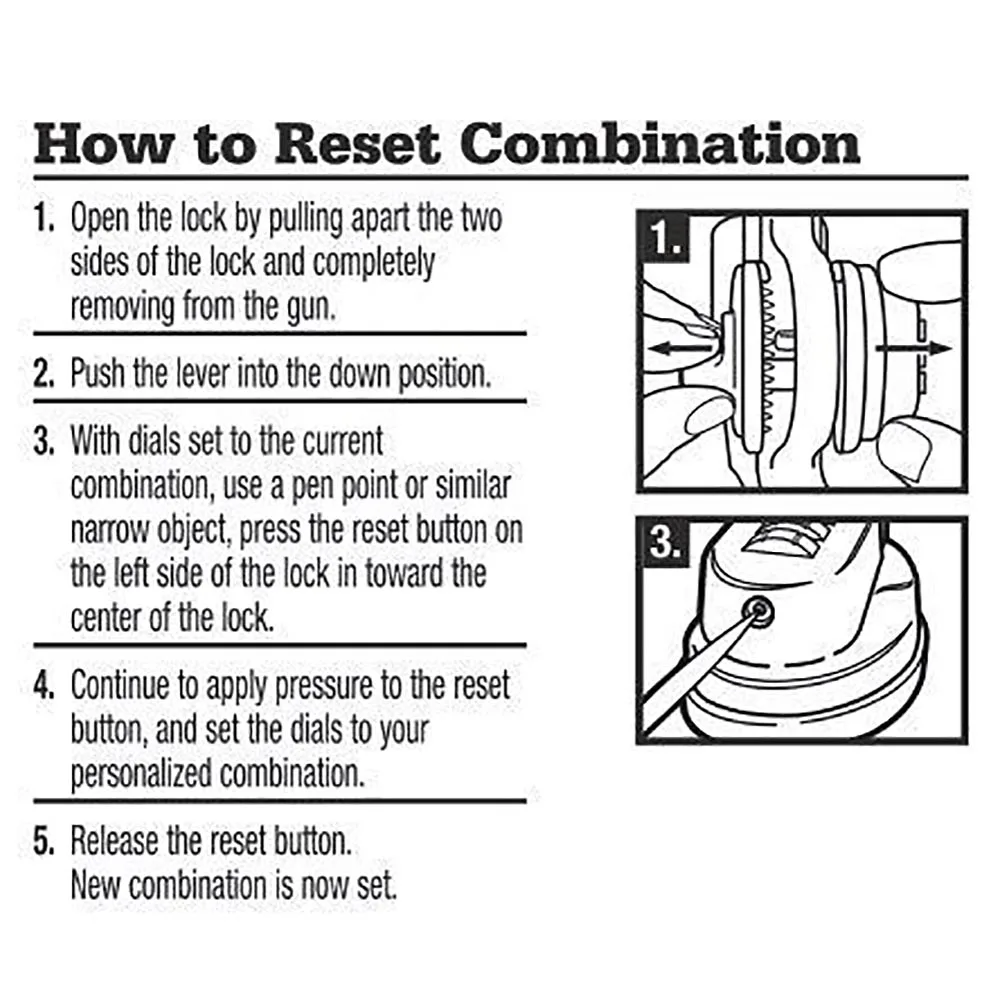 El bloqueo del gatillo de la pistola está preestablecido en 0-0-0: reinicie fácilmente la combinación de su elección simplemente presionando un clip en el botón de Reinicio