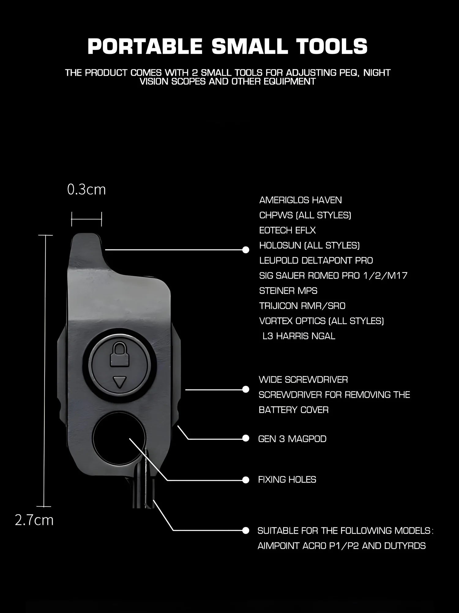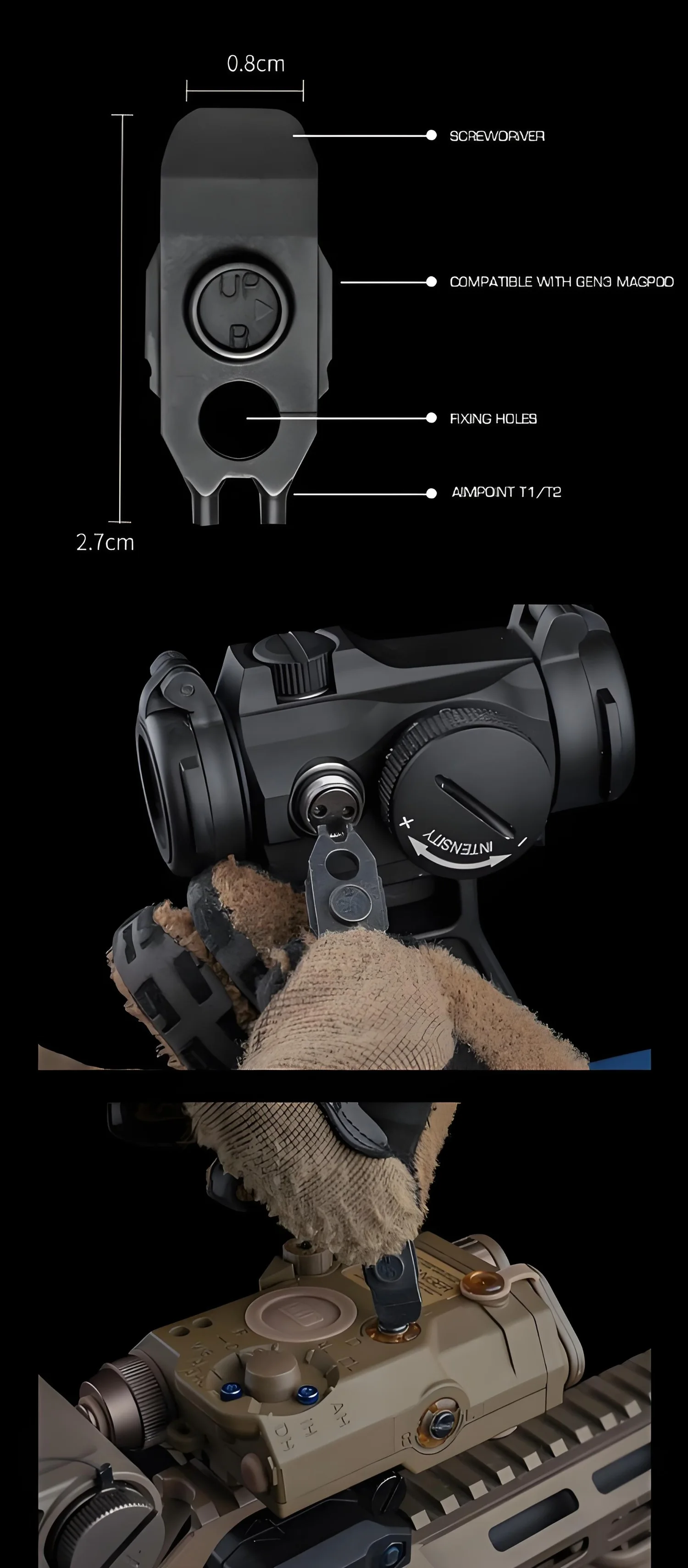 🔧 Compatibilidad exclusiva e incluye herramientas portátiles: este adaptador está diseñado con precisión solo para revistas GBB PMAG.Como fantástico beneficio adicional, el paquete incluye dos herramientas pequeñas portátiles diseñadas para ajustar una amplia gama de ópticas y dispositivos populares, que incluyen:
