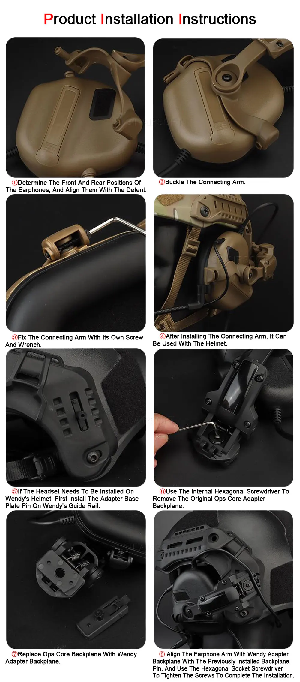 3 Los auriculares tácticos se instalan en el casco utilizando este producto.Cuando no esté en uso, los auriculares se pueden girar hacia la parte posterior del casco, lo que simplifica el método de almacenamiento y crea una apariencia muy discreta.