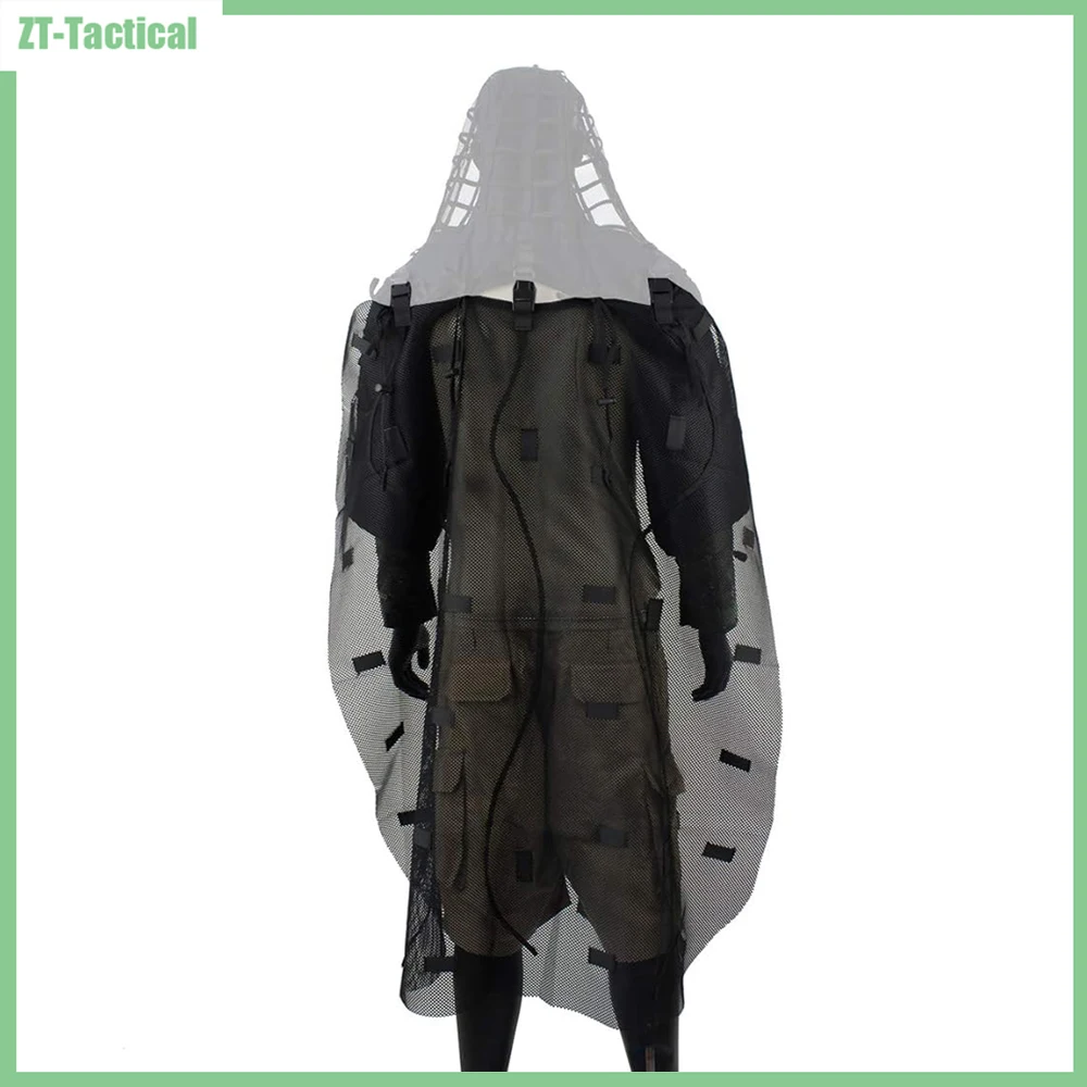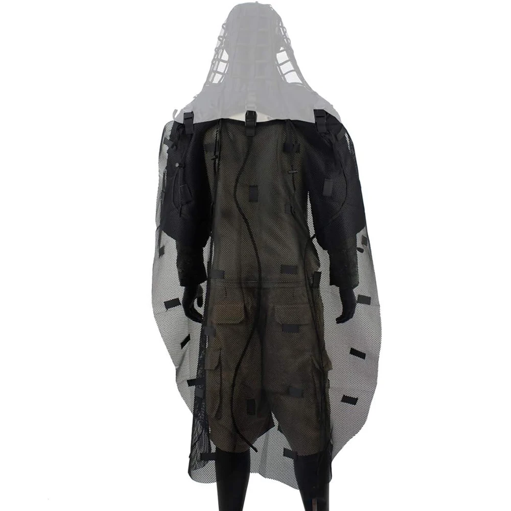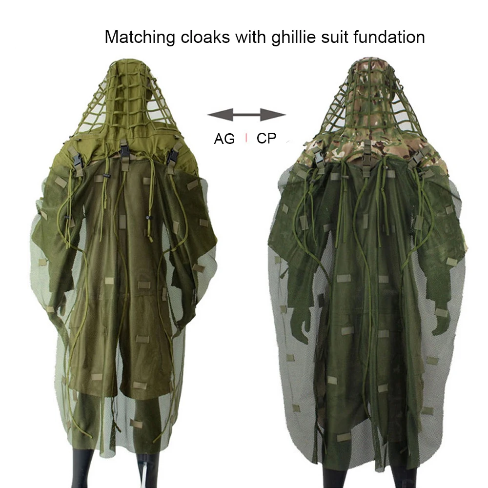 -La capa Ghillie: una capa de malla que se adhiere a la parte posterior de la capucha Ghillie para proporcionar camuflaje/ocultamiento para la espalda o las mochilas, A través de 3 hebillas de plástico y 4 cuerdas de nailon (con bloqueo de cordón. El cordón de nylon y los cierres de cordón se proporcionan para permitir que la capa se enrolle y asegure.