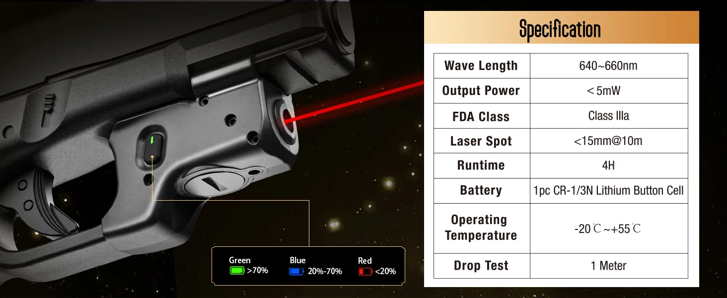 La primera mira láser está equipada con un indicador de encendido en el mercado, siempre prepárese para eventos tácticos y protección.El indicador muestra verde cuando el nivel de la batería está entre un 70% y un 100 %, azul entre un 20% y un 70 %, rojo entre un 0 y un 20 %.