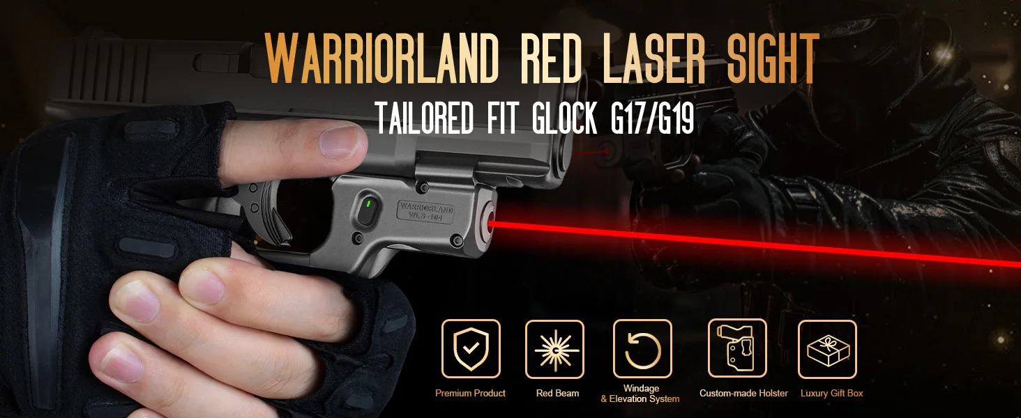 Mira láser WARRIORLAND WLS-104, hecha a medida para Glock 17/19 Gen 3-5, Glock 23/31/32 Gen 3-4 y Glock 19X/44/45.Es compacto y liviano para un mejor rendimiento de disparo y transporte oculto.