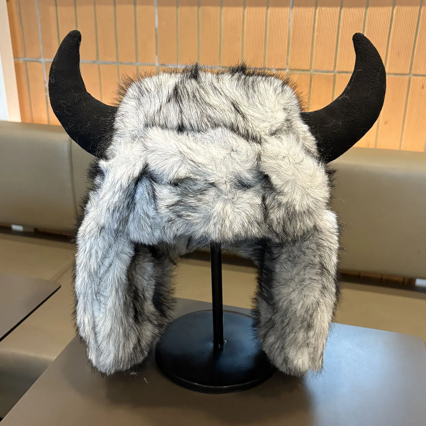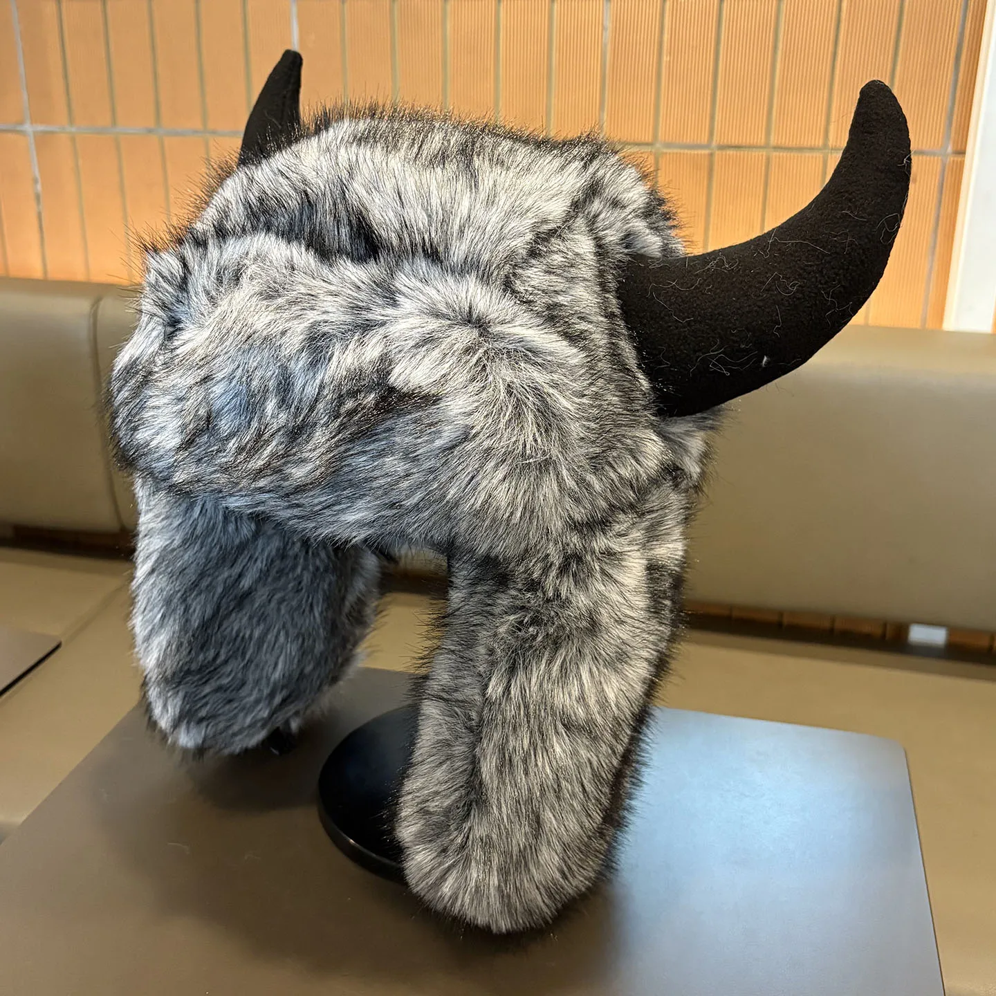 Este gorro está fabricado en China.Su característica de diseño es una forma de cabeza de toro de moda.Está confeccionado con un material de felpa grueso y forrado con una capa interior de algodón acolchado, lo que ofrece una excelente retención del calor.Es una opción ideal para personas que buscan una opción de moda para ropa de invierno al aire libre.