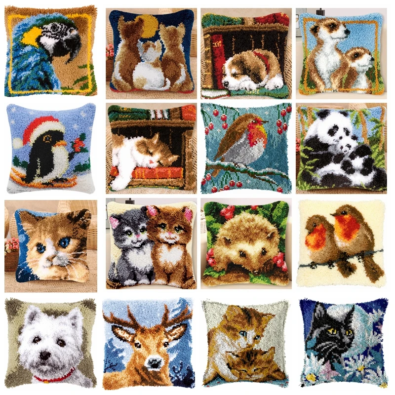 Hot Sale Animals Smyrna Latch Hook Pillow Carpet Embroidery Carpet Cushion Button Package DIY Latch Hook Rug Kits knoopkussen