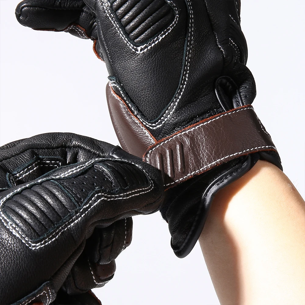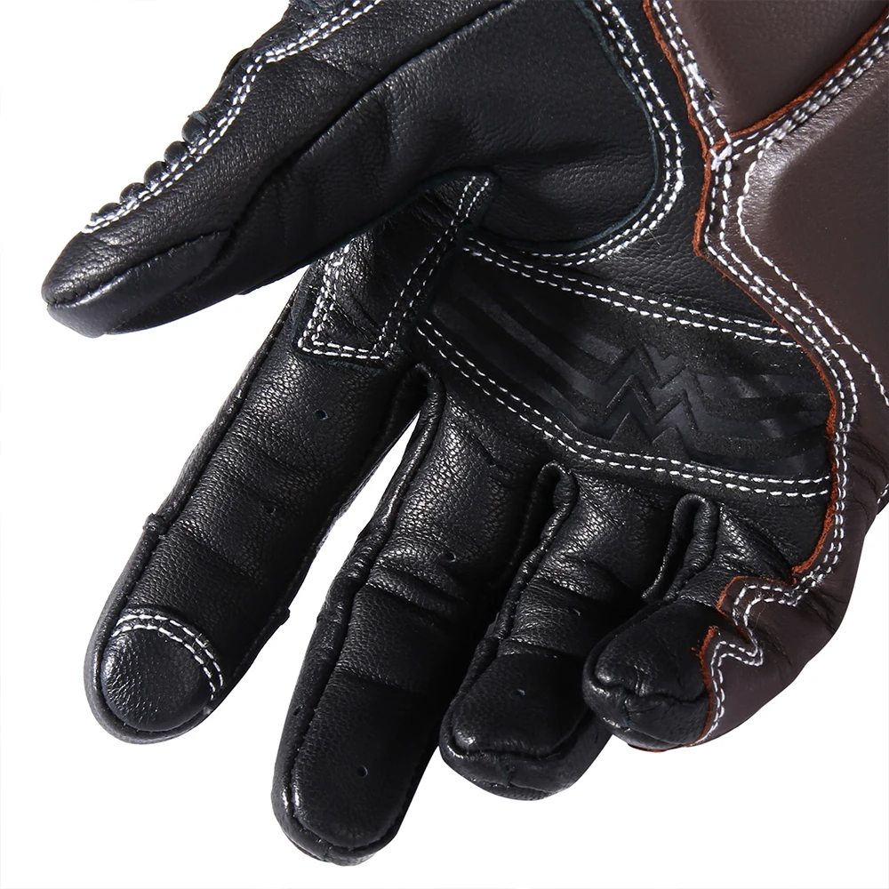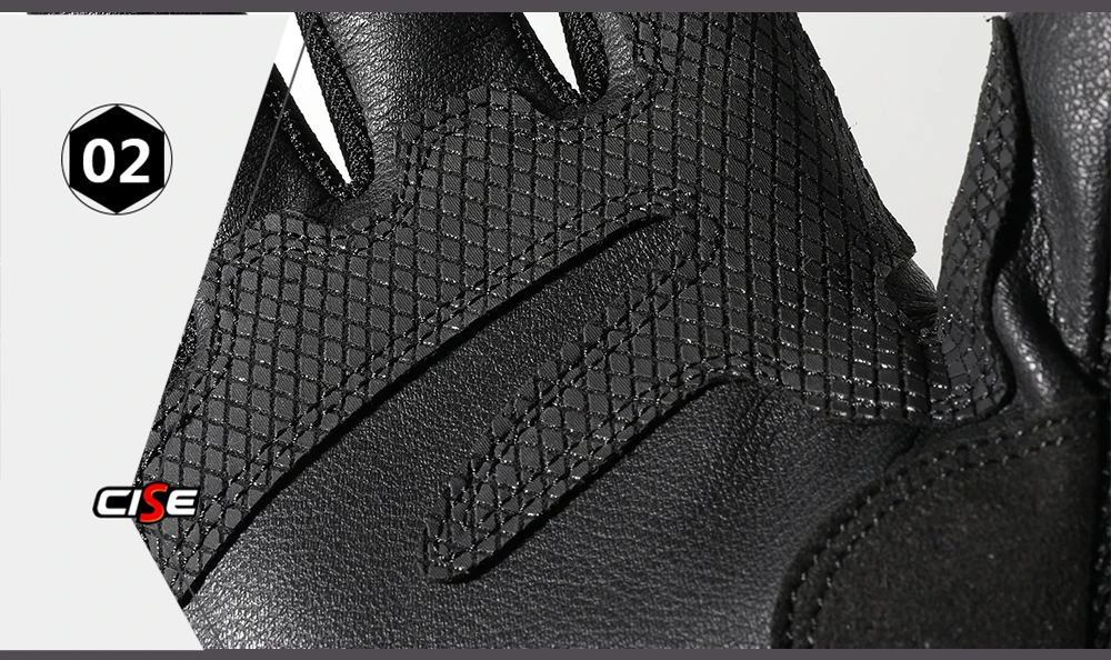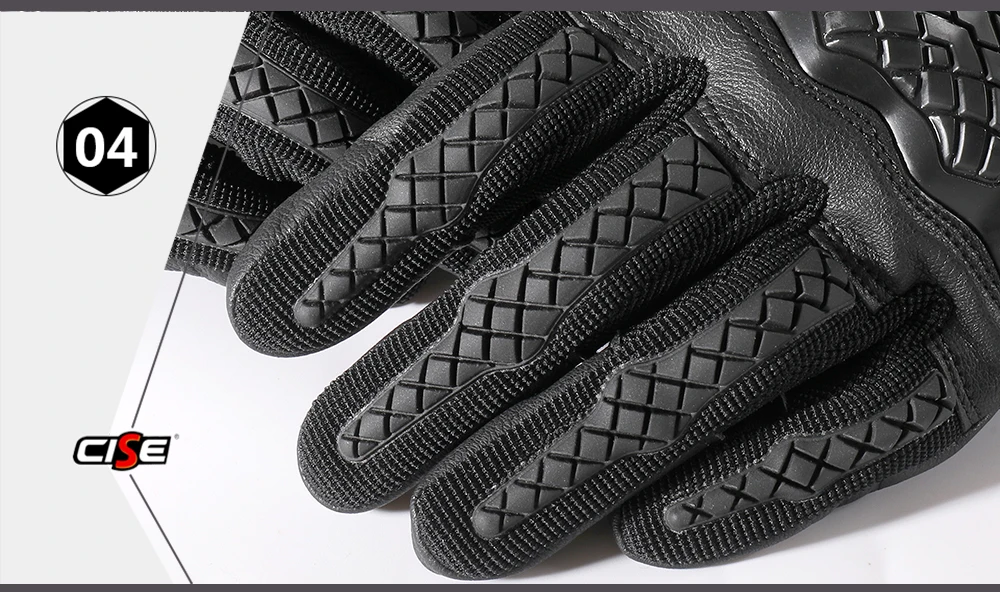 Guantes de moto de cuero genuino de diseño profesional CISE:Detalles del producto1.Outshell - Exterior: Cuero de cabra 95% Cuero de Cabra, Cuero sintético 5% Cuero sintetico; Forro-Forro : 100% poliéster-poliéster.2.Cuero Perforado: los dedos y la espalda del guante son de piel de cabra perforada. Proporcionando flujo de aire adicional, los orificios de los paneles de cuero perforado están diseñados para una protección óptima y un rendimiento de ventilación.3.Protección de manos y Palma: Cada guante cuenta con protección de manos reforzada de goma endurecida de alta densidad para cubrir contra insectos, rocas o escombros levantados de automóviles o accidentes desafortunados. Máxima protección y comodidad.4.Función de pantalla táctil: Las funciones mejoradas de la pantalla táctil vienen con el pulgar y el índice. Los guantes se pueden utilizar con cualquier número de dispositivos de pantalla táctil sin que el usuario tenga que quitarse los guantes.5.Elástico en la muñeca: La correa elástica alrededor de la muñeca del guante proporciona un control completo del usuario sobre lo apretado que el guante se ajusta a la mano. El sistema elástico se utiliza en tándem para apretar o aflojar el guante según las preferencias del usuario.