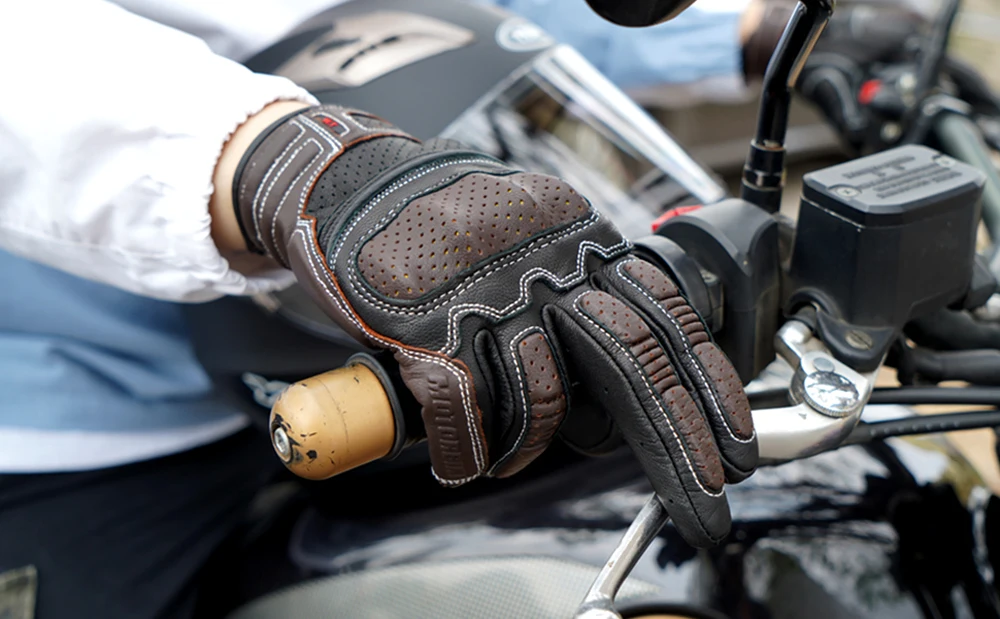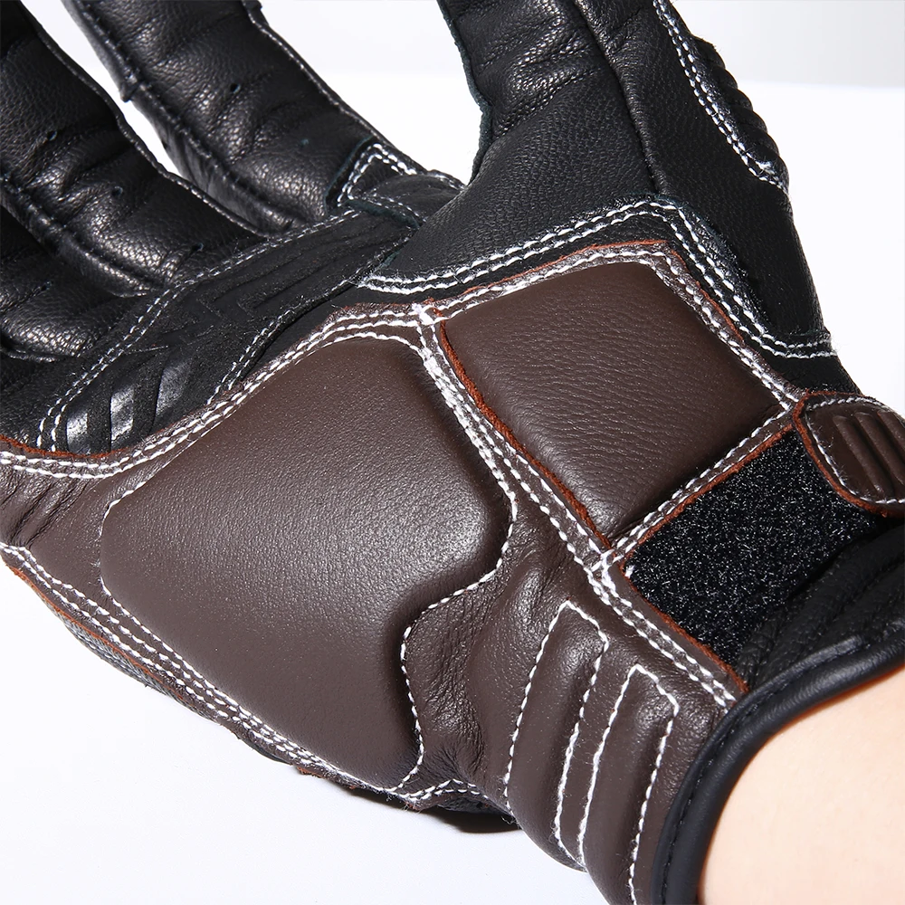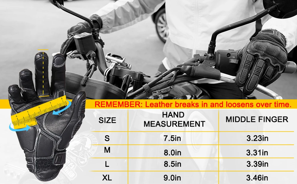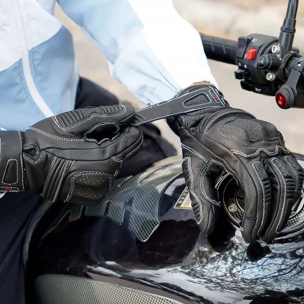 Guantes de moto de cuero genuino de diseño profesional CISE:Detalles del producto1.Outshell - Exterior: Cuero de cabra 95% Cuero de Cabra, Cuero sintético 5% Cuero sintetico; Forro-Forro : 100% poliéster-poliéster.2.Cuero Perforado: los dedos y la espalda del guante son de piel de cabra perforada. Proporcionando flujo de aire adicional, los orificios de los paneles de cuero perforado están diseñados para una protección óptima y un rendimiento de ventilación.3.Protección de manos y Palma: Cada guante cuenta con protección de manos reforzada de goma endurecida de alta densidad para cubrir contra insectos, rocas o escombros levantados de automóviles o accidentes desafortunados. Máxima protección y comodidad.4.Función de pantalla táctil: Las funciones mejoradas de la pantalla táctil vienen con el pulgar y el índice. Los guantes se pueden utilizar con cualquier número de dispositivos de pantalla táctil sin que el usuario tenga que quitarse los guantes.5.Elástico en la muñeca: La correa elástica alrededor de la muñeca del guante proporciona un control completo del usuario sobre lo apretado que el guante se ajusta a la mano. El sistema elástico se utiliza en tándem para apretar o aflojar el guante según las preferencias del usuario.