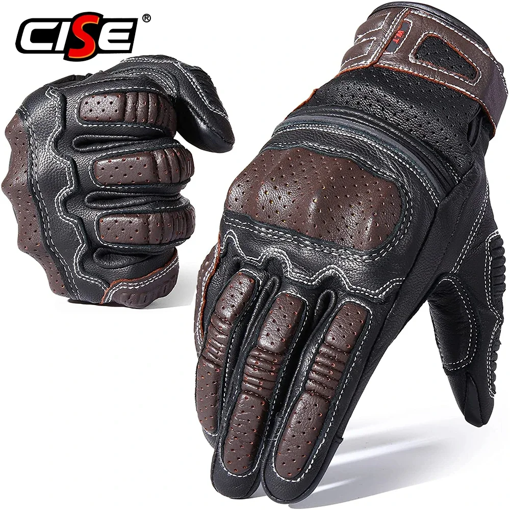 Guantes de moto de cuero genuino de diseño profesional CISE:Detalles del producto1.Outshell - Exterior: Cuero de cabra 95% Cuero de Cabra, Cuero sintético 5% Cuero sintetico; Forro-Forro : 100% poliéster-poliéster.2.Cuero Perforado: los dedos y la espalda del guante son de piel de cabra perforada. Proporcionando flujo de aire adicional, los orificios de los paneles de cuero perforado están diseñados para una protección óptima y un rendimiento de ventilación.3.Protección de manos y Palma: Cada guante cuenta con protección de manos reforzada de goma endurecida de alta densidad para cubrir contra insectos, rocas o escombros levantados de automóviles o accidentes desafortunados. Máxima protección y comodidad.4.Función de pantalla táctil: Las funciones mejoradas de la pantalla táctil vienen con el pulgar y el índice. Los guantes se pueden utilizar con cualquier número de dispositivos de pantalla táctil sin que el usuario tenga que quitarse los guantes.5.Elástico en la muñeca: La correa elástica alrededor de la muñeca del guante proporciona un control completo del usuario sobre lo apretado que el guante se ajusta a la mano. El sistema elástico se utiliza en tándem para apretar o aflojar el guante según las preferencias del usuario.