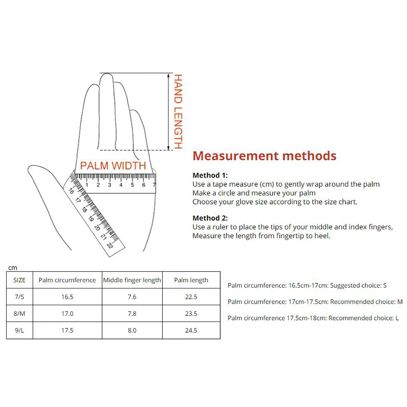 2. Los datos de medición de los guantes no mostraron ningún estiramiento. Cada estilo de guantes tiene un grado diferente de estiramiento. Utilice cinta para medir su ancho y comparar la tabla de tallas para elegir el tamaño adecuado. Hay una ligera desviación. Elija el mejor tamaño según el efecto de uso real.