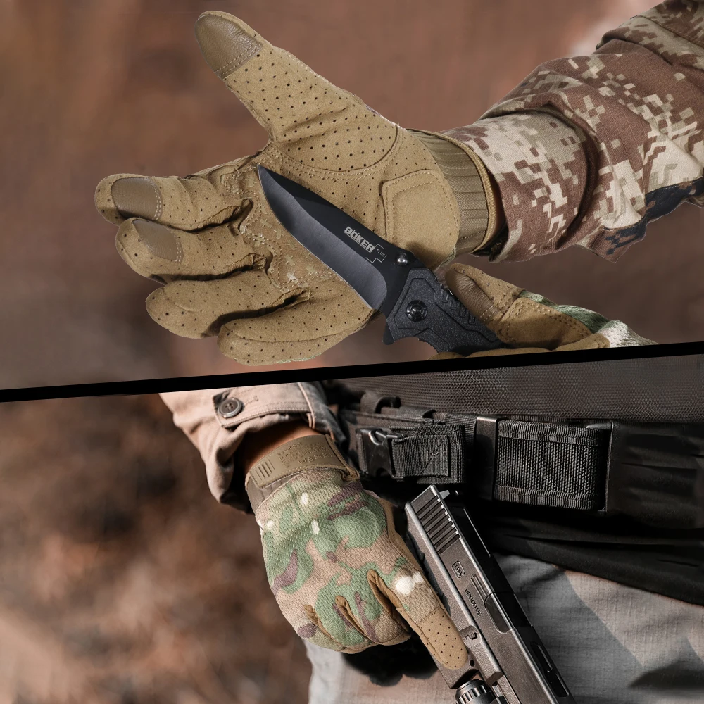 • Protección de la parte posterior de la mano: los guantes cuentan con nudillos reforzados y articulaciones de los dedos para proteger sus manos del impacto y la abrasión durante actividades al aire libre u operaciones tácticas.