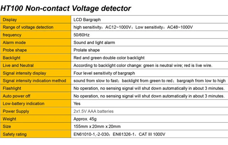 Seguridad primero:Enviará múltiples alarmas a través del sonido y la luz. Cuando se detecta voltaje, la punta enviará luz roja y pitido. Cuando cuanto más alto es el voltaje detectado o más cerca está a la fuente de voltaje, emite un pitido a una frecuencia más alta. Al mismo tiempo, la pantalla será roja o verde, roja significa que se detecta alto voltaje y cable vivo, verde significa que se detecta bajo voltaje y cable nulo.