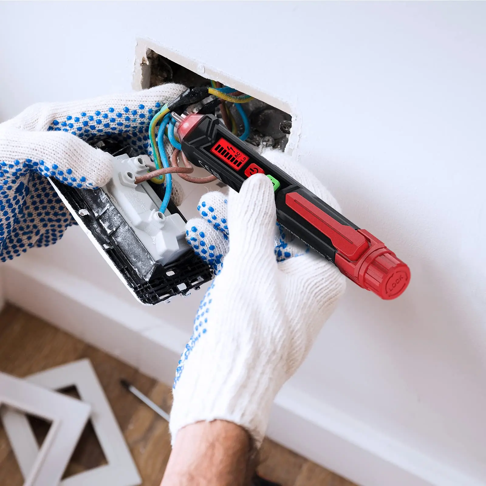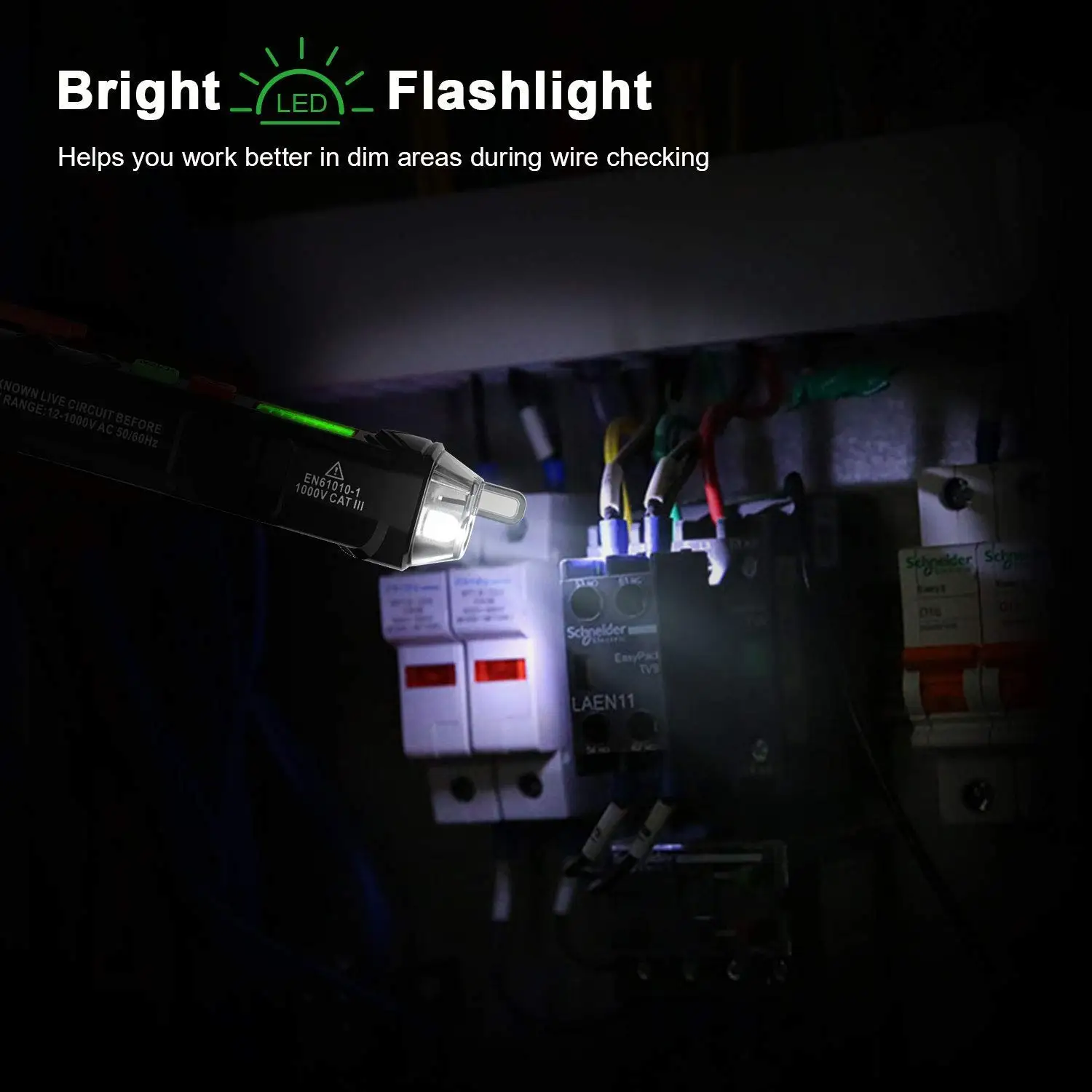 Sin Contacto:Con sonda inductiva NCV para voltaje de CA; Simplemente coloque la punta cerca de una tira de terminales, salida o cable de suministro. Cuando la punta brilla en rojo y el bolígrafo emite un pitido, sabes que hay voltaje presente. El detector de cables en vivo puede detectar automáticamente el cable vivo o neutro. Ideal para la prueba del punto de interrupción. Práctico probador de circuito para electricistas y propietarios de viviendas.