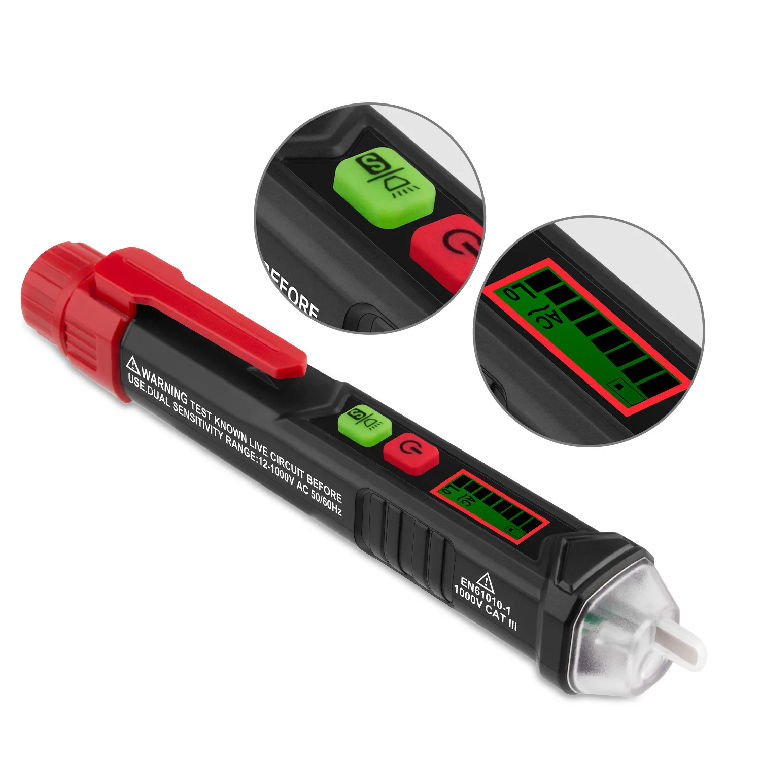 Rango doble:Detecta voltaje estándar y bajo (12-1000V CA/48-1000V CA) para mediciones más sensibles y flexibles. Presione el botón S para ajustar la sensibilidad y adaptar el rango bajo para timbres, termostatos, cableado de riego, etc.; El sensor NCV reconoce automáticamente el voltaje y lo muestra en el gráfico de barras.