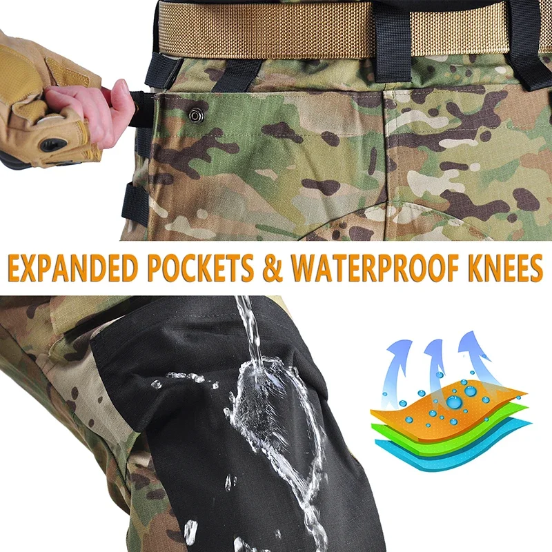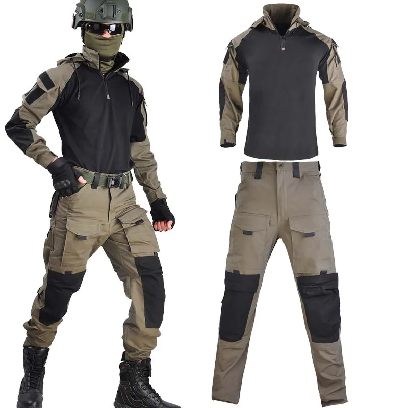 HAN WILD Traje al aire libre Hombres Conjunto de senderismo táctico Ropa de escalada Uniforme de combate Camisa de Safari Camping Pantalones Softair Traje de cazaMaterial:Tejido de punto sólido: 60% poliéster + 35% algodón + 5% spandexTela de camuflaje: 60% poliéster + 40% algodónCaracterística:Camisas:1.Transpirable y transpirable sin calor sofocante.2.Tejido elástico para un movimiento sin restricciones3.Ajuste de puños con velcro4.Diseño con cordón con capucha.5.Conexión de cremallera de sombrero, desmontable6.Refuerzo de tejido de doble capa en el codo para mayor resistencia al desgaste.7.La cremallera YKK es duradera y suave. Pantalones:1.Hebilla de cinturón ajustable + gancho para cinturón Puños ajustables con velcro2.Diseño colgante lateral, fortalece la carga.
