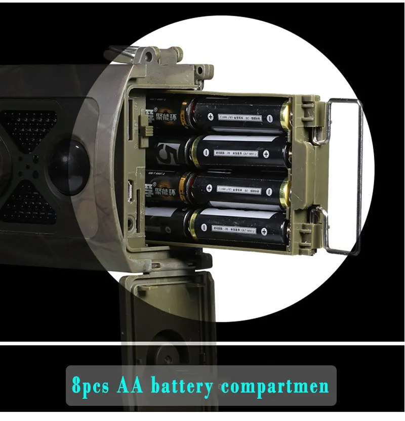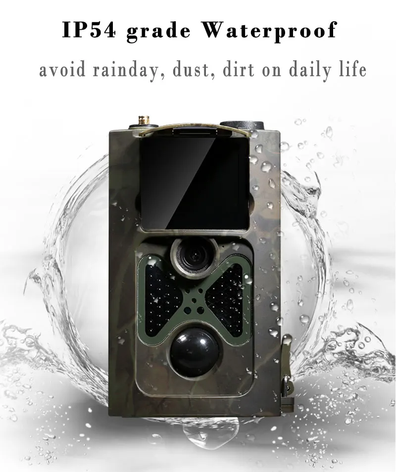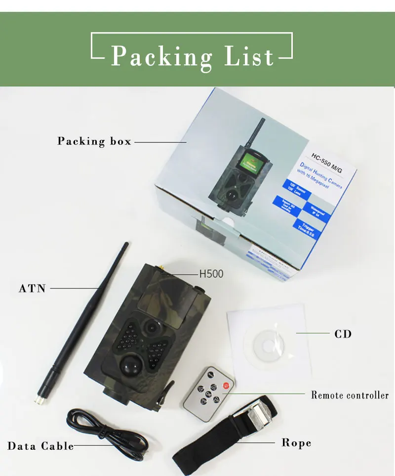 Sensor de imagen: 8 megapíxeles Color CMOS Memoria: Tarjeta TF a 32GB(NO INCLUIDO) Lente: F=3,1; FOV=120 ° Tamaño: 145mm * 80mm * 55mm Corte IR: Filtro IR completamente automático Pantalla: 2,0 pulgadas Ángulo de detección PIR: 120 grados Rango de visión nocturna: 65 pies/20 metros LED IR: 24 LEDs IR PIR Distancia: 65 pies/20 metros Tiempo de disparo: 0,5 segundos de retardo PIR: 1/5/10/30sec/MIN (predeterminado 1 seg) Resolución de imagen: 16MP/12MP/8MP Disparo múltiple: 1/3/6/9 Resolución de vídeo: 1080P/720P/WVGA/VGA Formato de archivo: JPEG/AVI Resolución de imagen seleccionable: Sí Fotos múltiples en una detección: Sí Seguridad de la contraseña: 4 bandas de Frecuencia de Código PIN digital: 2G GSM 850/900/1800/1900 MHz Control remoto: Transmisión SMS GPRS: Transferencia de datos por correo electrónico MMS al teléfono: 1-4 números de teléfono MMS al correo electrónico: 1-4 direcciones de correo electrónico Consumo de energía en espera: 0.2mA Tiempo de espera máximo: 6 meses (8X AA) Puerto de interfaz: USB 2,0; Soporte TF de tarjeta; 9V DC Accesorios externos: Correa Temperatura de trabajo: -30 ~ + 70 ℃ Potencia: 8 × batería AA (NO INCLUIDA) Impermeable: IP65 Certificado: FCC,CE,RoHS Modo: Cámara/Video/Cámara y Video/Timelapse