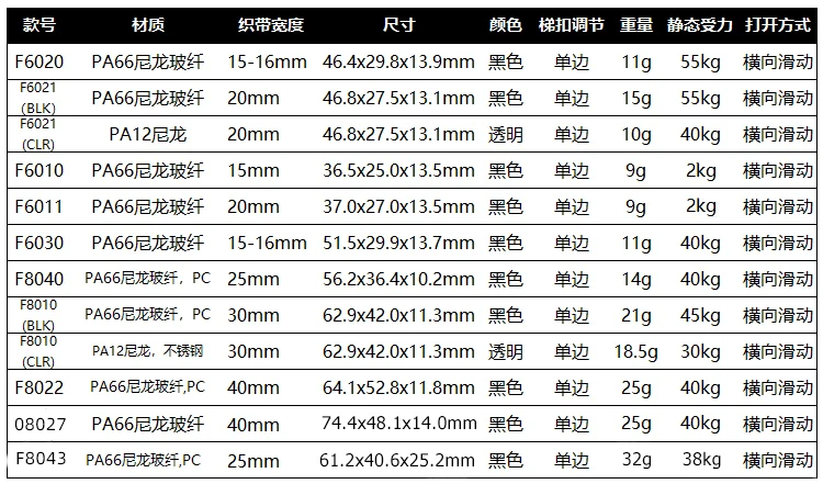Esta serie ofrece una selección de productos adecuados para anchos de correas de 15 mm/ 20 mm/ 25 mm/ 30 mm/ 40 mm. También existe un estilo de barra ósea, especialmente adecuado para la hebilla del pecho de la mochila.