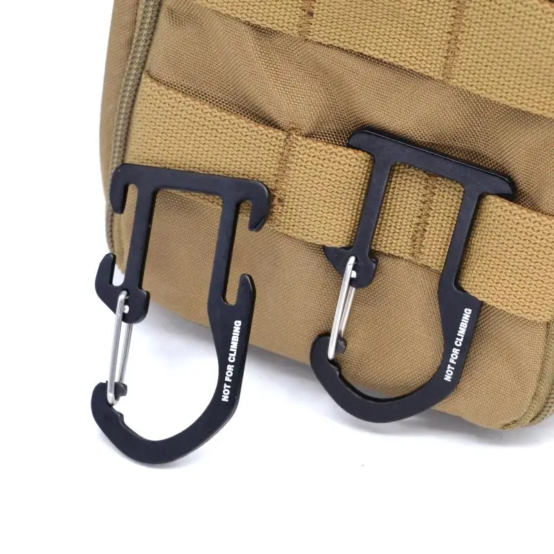 En cuanto a los ganchos para colgar y sujetar temporalmente equipos de primera línea después de retirarlos, actualmente estoy probando este producto de accesorio de correas del sistema MOLLE en comparación con un producto ya preparado para ver cuál es más rápido de instalar y más fácil de liberar. Si fuera posible, me hubiera gustado que la parte delantera del gancho fuera del mismo color negro mate que la parte trasera, y me hubiera gustado que la advertencia "NO PARA ESCALAR" estuviera grabada en la parte trasera en lugar de en la parte delantera.