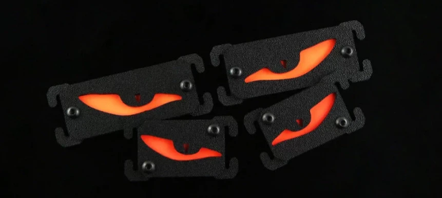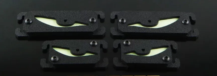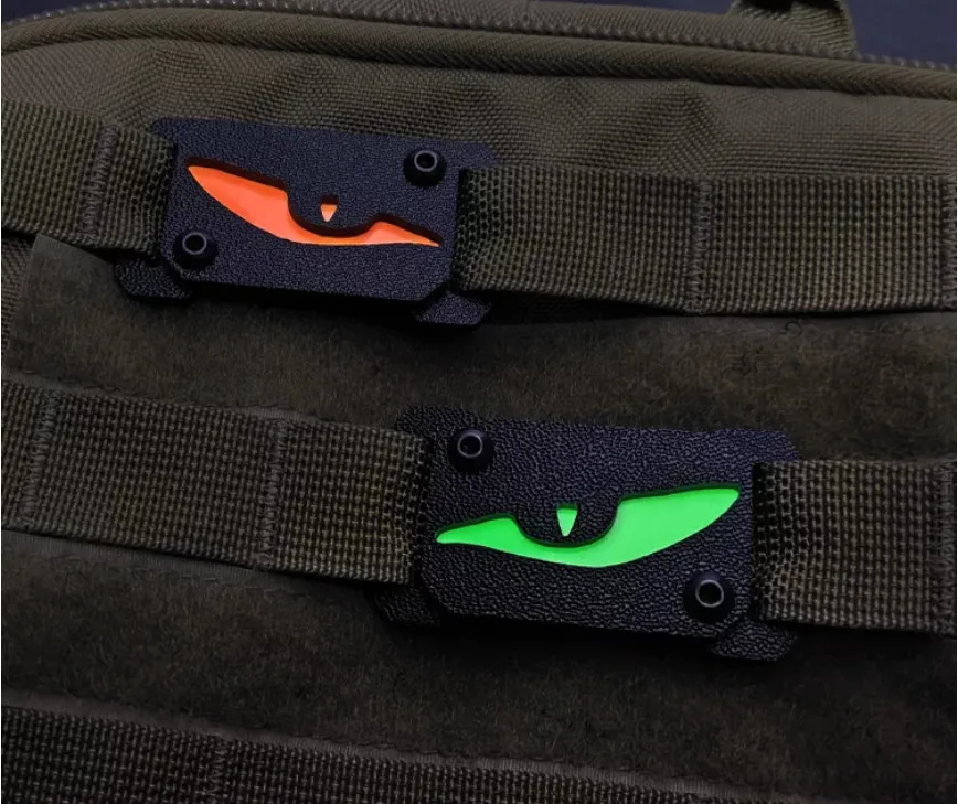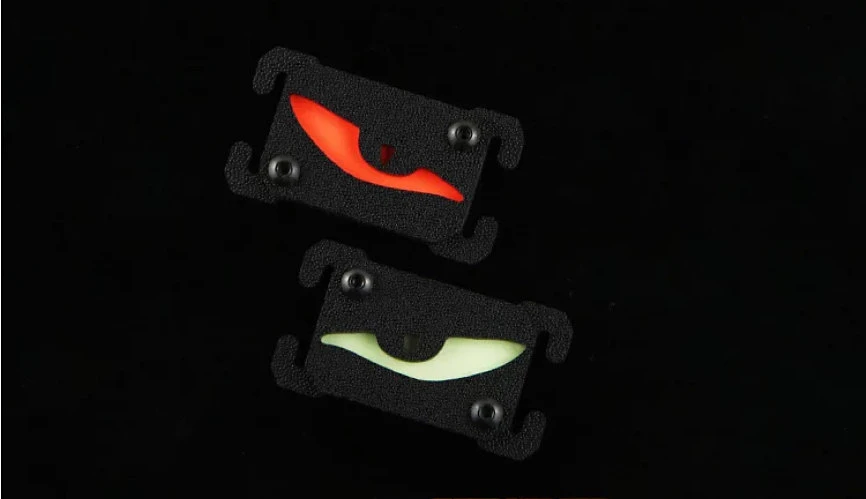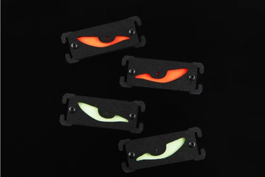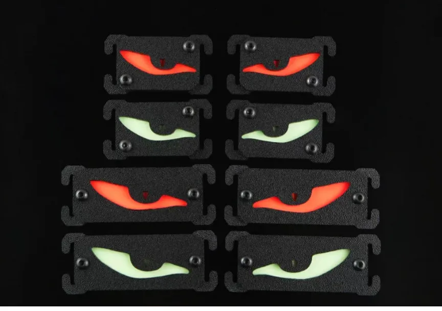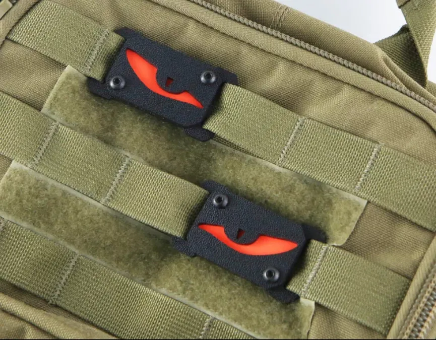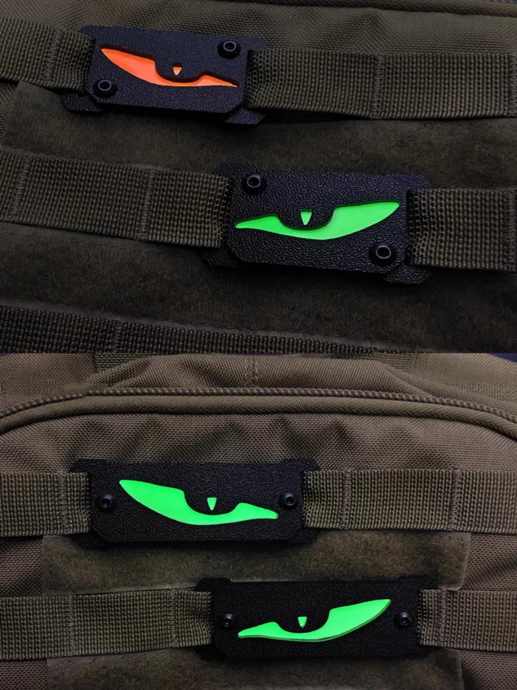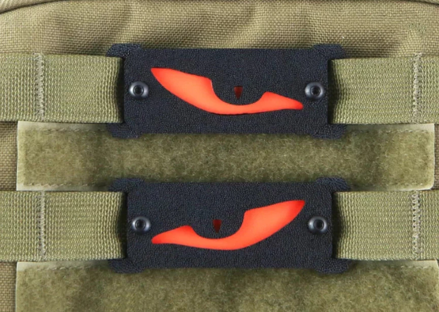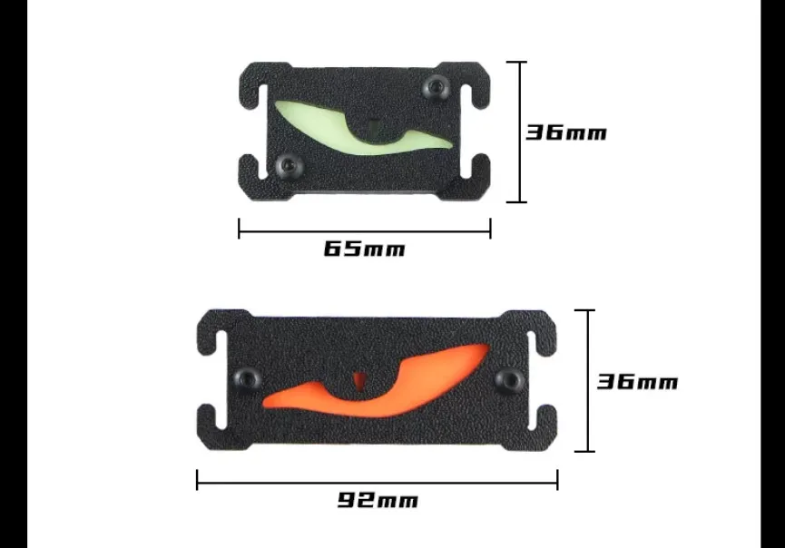 Nombre del producto: cursor nocturno de ojos del diablo Material: plástico de ingeniería Luminiscencia: Puede emitir luz después de absorber la luz. Aplicable: sistema molle Montaje: chalecos tácticos, mochilas molle, etc.