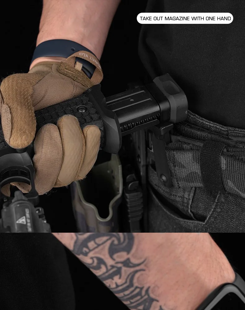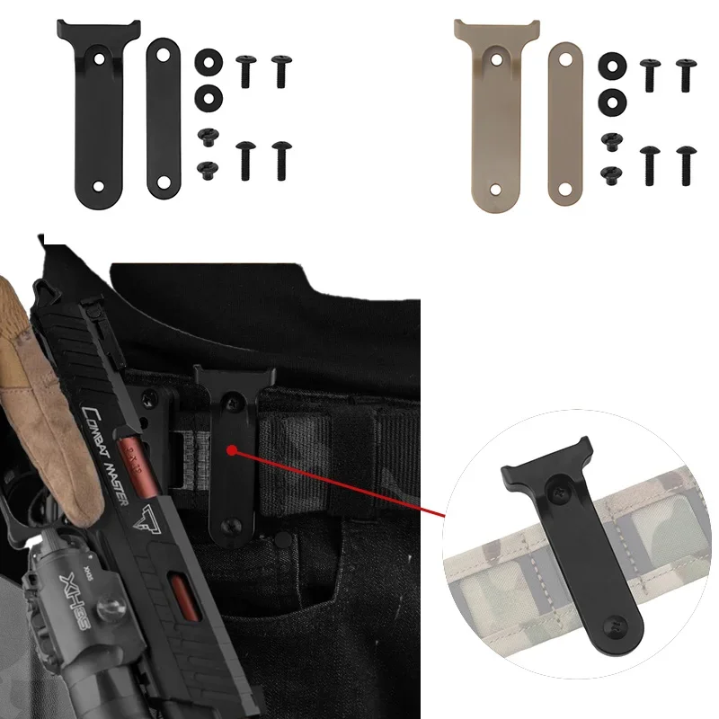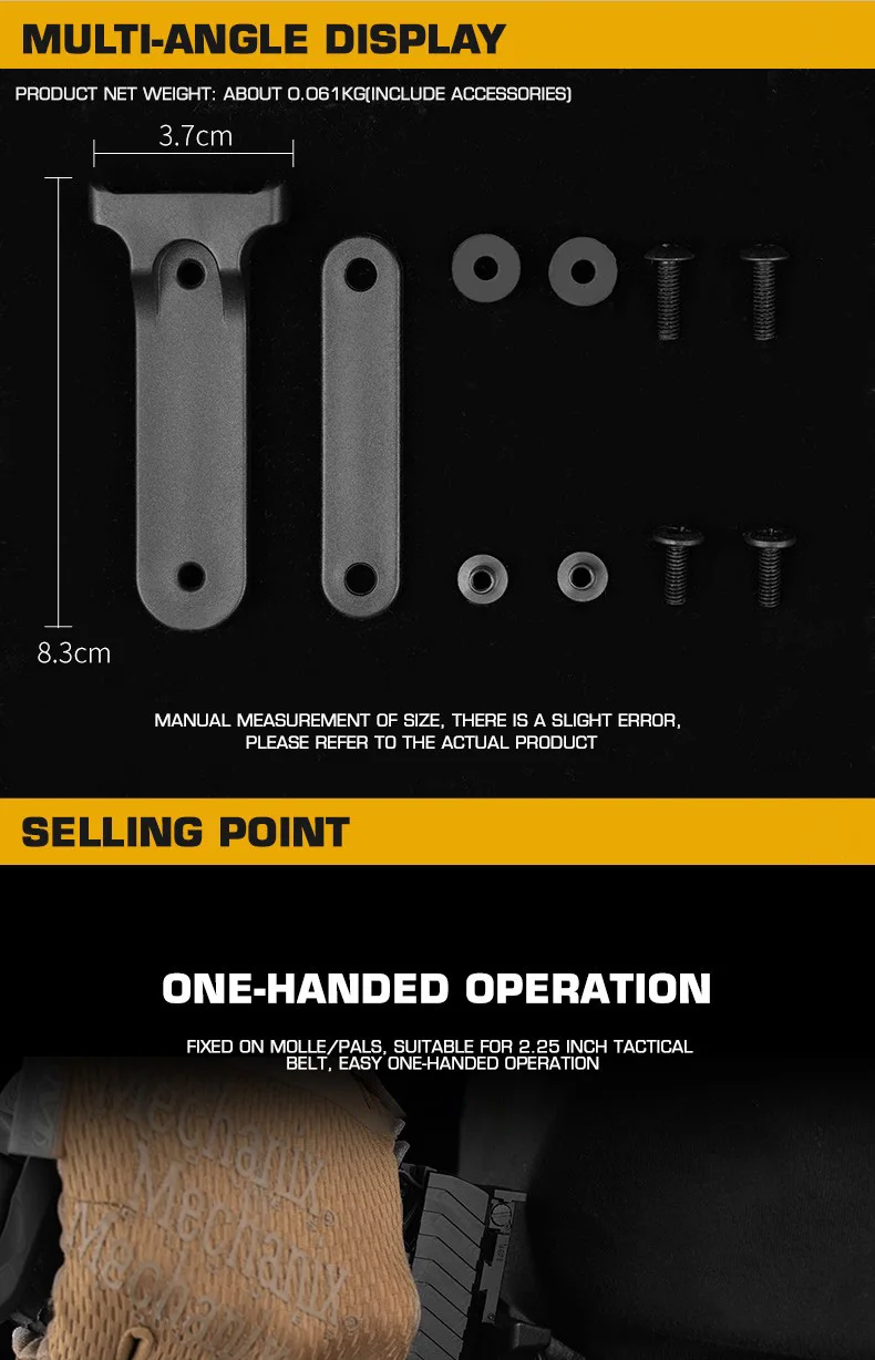 ② La herramienta auxiliar de manipulación de pistola de una mano se puede montar en cinturones de combate MOLLE de hasta 2,25 "de ancho. (Los tornillos están incluidos).
