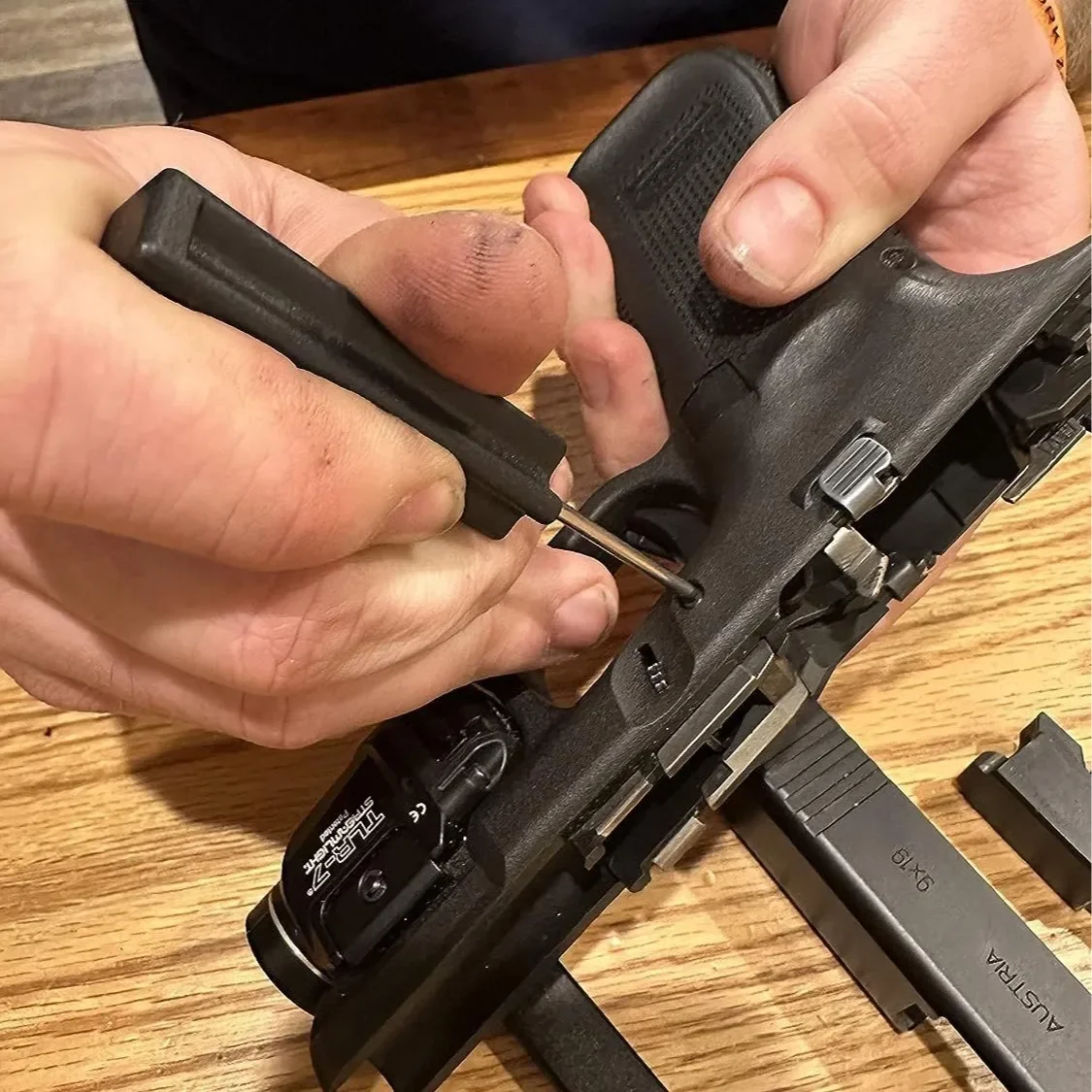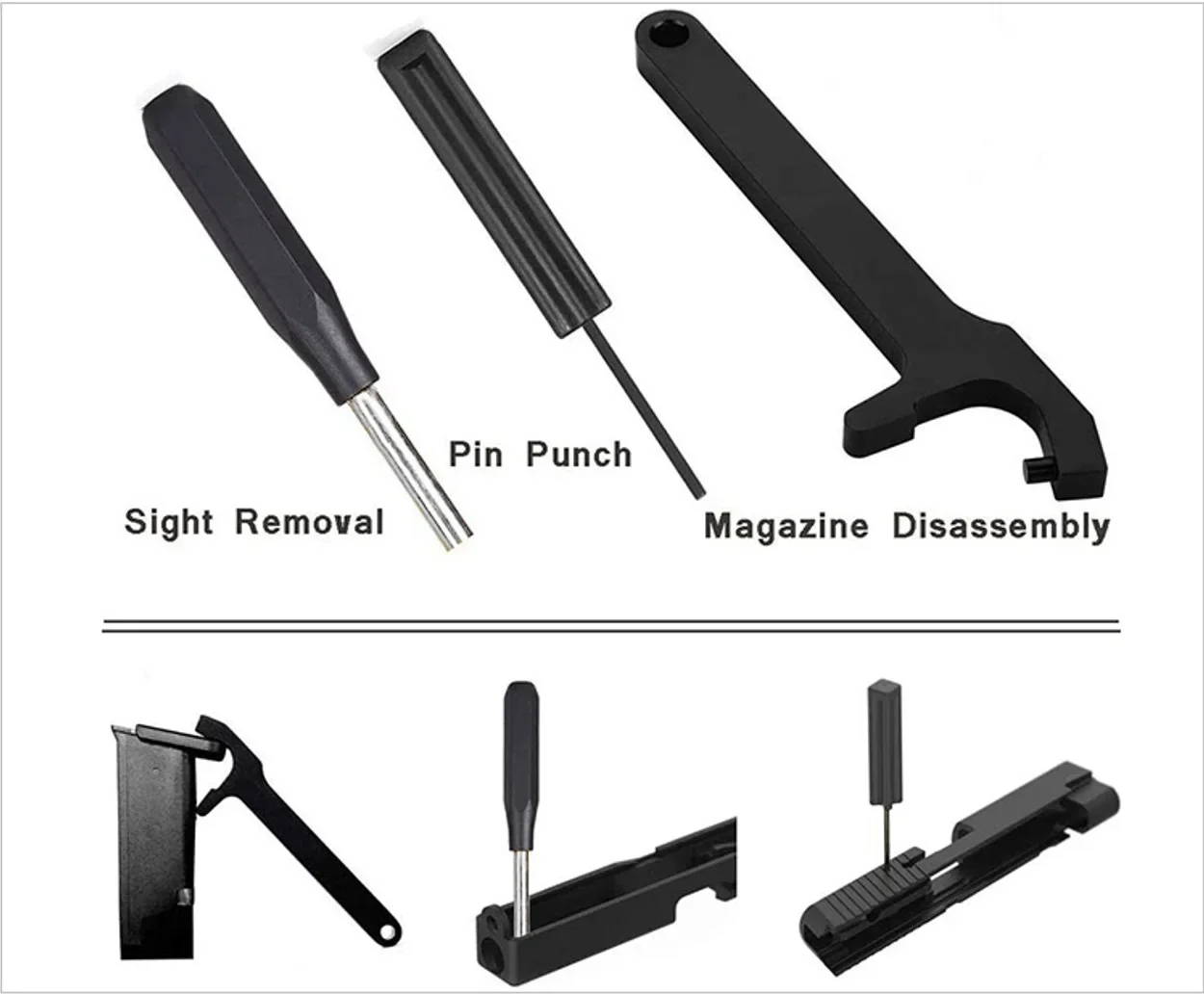 Un kit básico pero todo funciona como debería. La herramienta para quitar la placa de suelo es especialmente buena. Si bien el diseño es simple, funciona bien al quitar la placa de piso Glock difícil de quitar. Hay otras herramientas similares que hacen el mismo trabajo, pero esta funciona igual de bien y es barata.