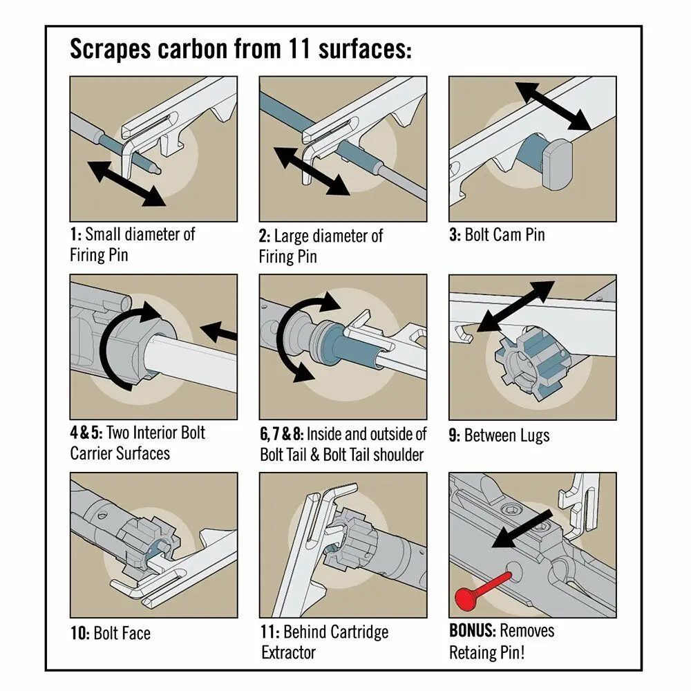 El carbono es el enemigo de las armas. El uso regular construye rápidamente carbono en pernos y pasadores de anillo. Las piezas móviles requieren una solución de raspado de precisión, por lo que desarrollamos The Raschiper: el primer raspador diseñado para limpiar 12 superficies críticas del grupo porta pernos. El innovador diseño giratorio de doble extremo ahorra tiempo al eliminar el carbón rápida y fácilmente de todo el grupo de soportes de pernos. El carbono acaba de escapar de lugares para esconderse.