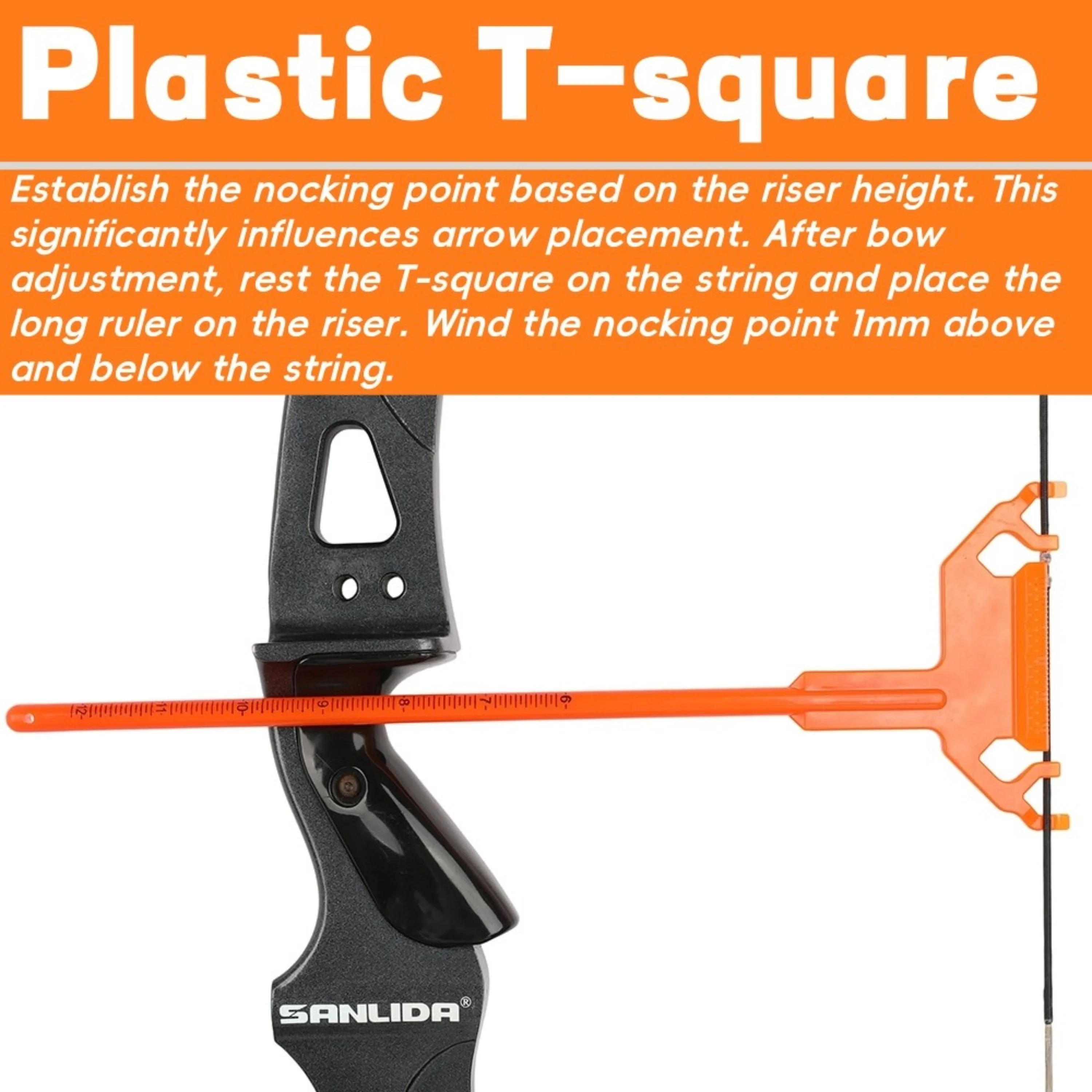 2. Medición precisa de la altura del soporte: diseñado para medir la altura del soporte del arco (normalmente 22,5 a 25 cm) colocando el cuadrado en forma de T contra el elevador y extendiéndolo hasta la cuerda del arco, lo que ayuda a optimizar la precisión del disparo.