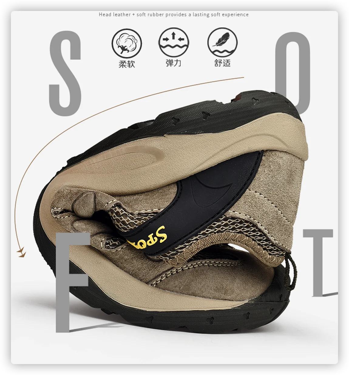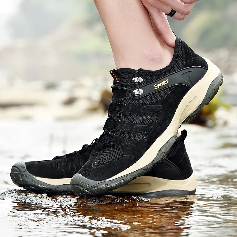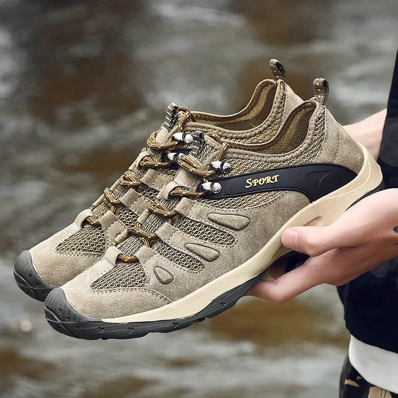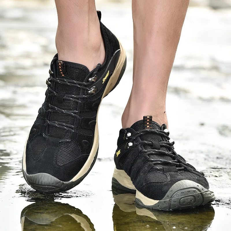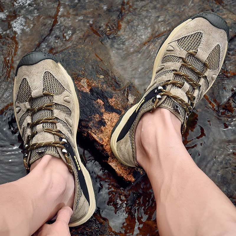 HIKEUP hombres montañismo zapatos de cuero genuino al aire libre zapatos de malla transpirable cómodo deporte Casual caza zapatillas