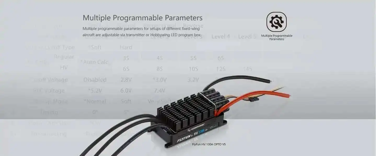Modo de conmutación: 5,2 V/6 V/7,4 V, 10 A/25 A LiPo 6-14S92,7*45,6*27mm 180 gramos LEDTarjeta de programación FLYFUN-130A-HV-OPTO-V5130A