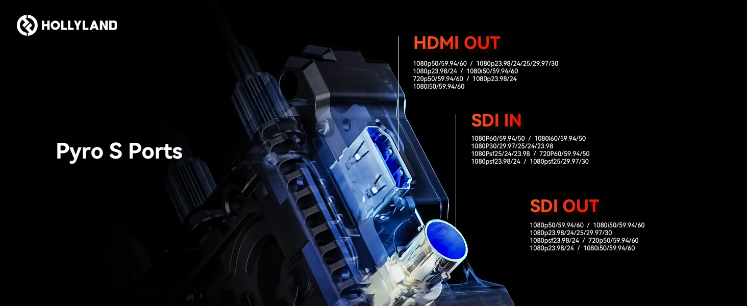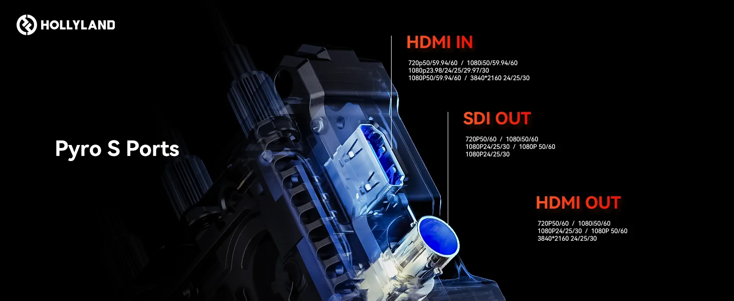 Pyro S cuenta con robustos puertos HDMI y SDI, que admiten una amplia gama de formatos de entrada/salida de video para una máxima compatibilidad con equipos estándar de la industria.Con resoluciones de hasta 4K30fps a través de HDMI y un manejo versátil de la velocidad de fotogramas a través de SDI (23,98/29,97/59,94 FPS), este dispositivo garantiza que sus producciones estén equipadas para brindar fidelidad visual y flexibilidad de primer nivel.
