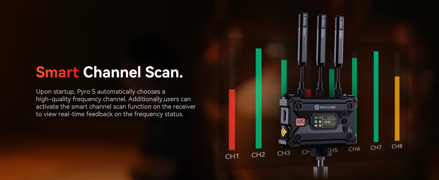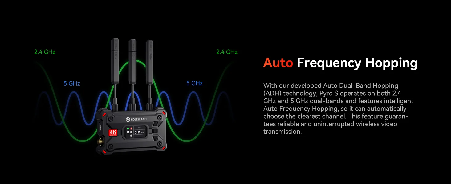 Pyro S eleva su producción con una impresionante resolución de 4K/30 fps, lo que garantiza imágenes nítidas y claras para un contenido de alto impacto.Complementado con la tecnología Auto Dual-Band Hopping(ADH), cambia automáticamente entre frecuencias de 2,4 GHz y 5 GHz para mantener la mejor señal posible sin interferencias.