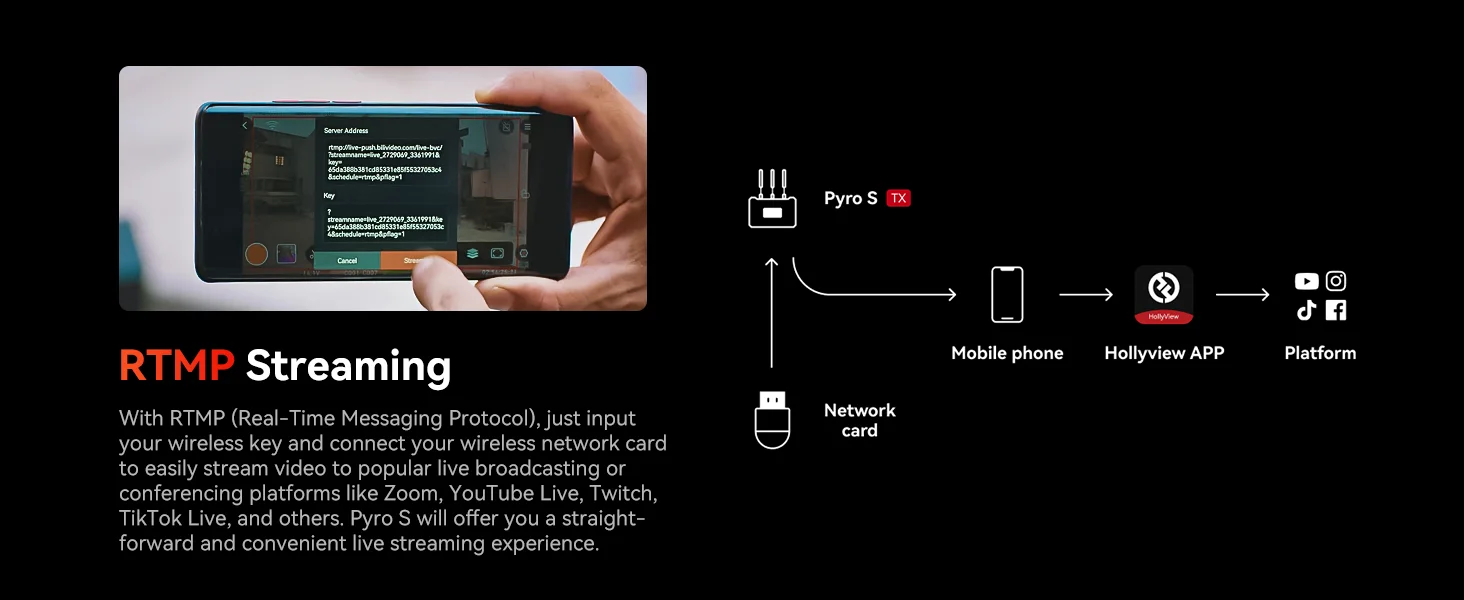 Pyro S simplifica la transmisión en vivo aprovechando UVC (USB Video Class) para compatibilidad plug-and-play con computadoras, sin necesidad de tarjetas de captura ni software complejo. Además, está equipado con capacidad de transmisión RTMP; simplemente conéctese a su red a través de una tarjeta inalámbrica y estará listo para transmitir directamente a plataformas como YouTube Live, TikTok Live y más.