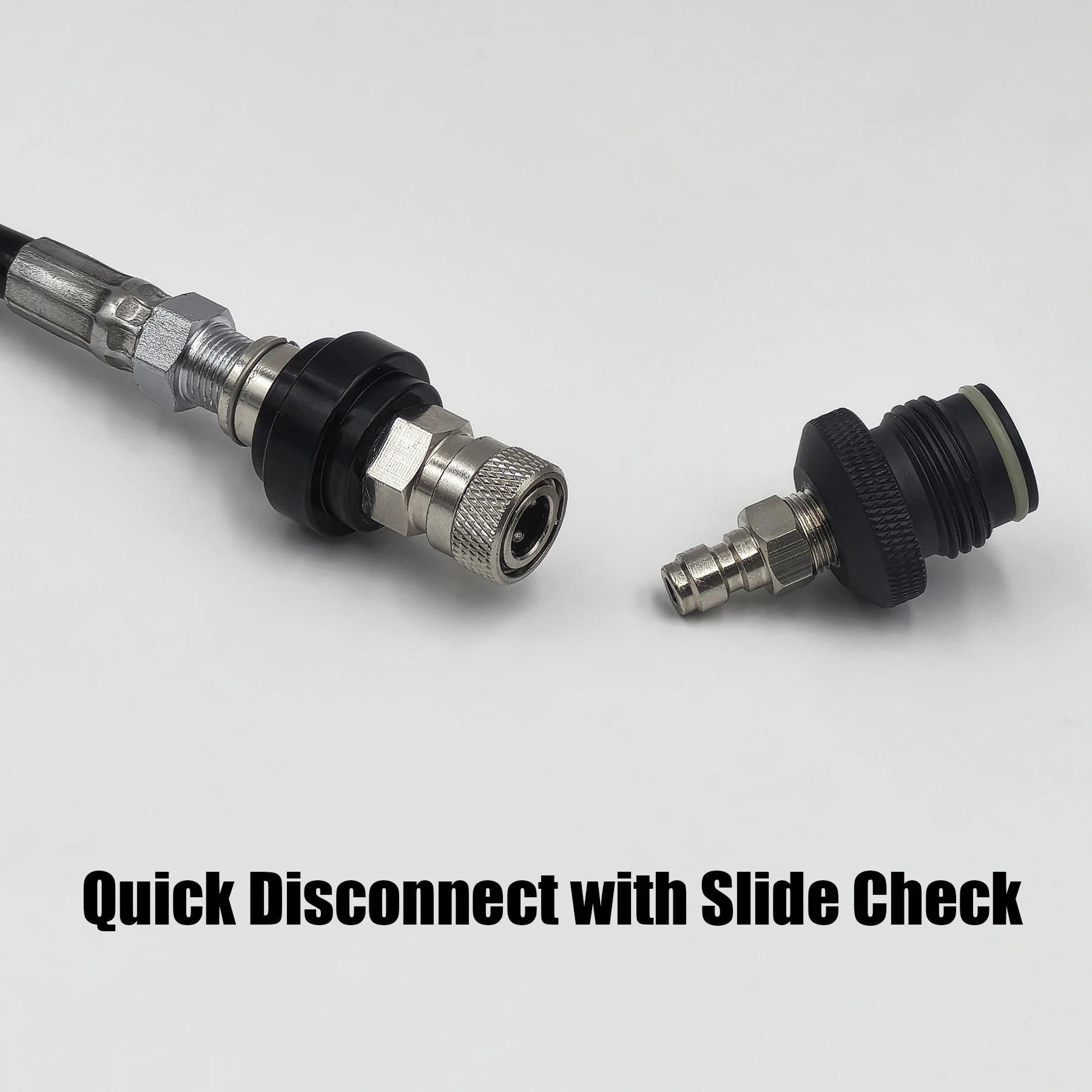 Fácil de poner o quitar del aire, no es necesario desconectarlo del cilindro ni del marcador.Cuando empuje el control deslizante hacia abajo, libere el gas residual conectado al marcador, lo que es más seguro.