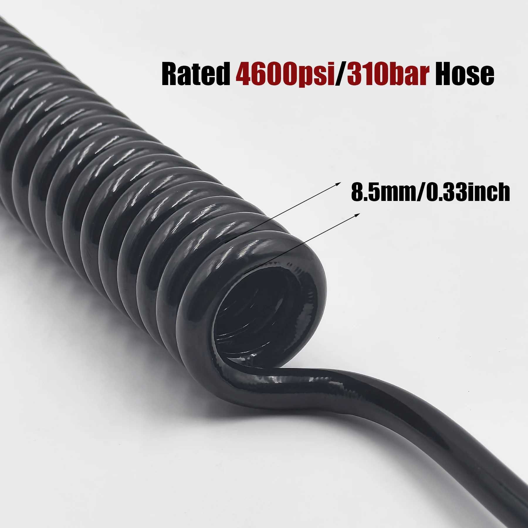 Manguera de alta presión real, prueba de presión de voladura 11516 psi, presión de trabajo máxima 4600 psi, el tamaño completamente extendido de la manguera en espiral es de 250 cm/100 pulgadas.