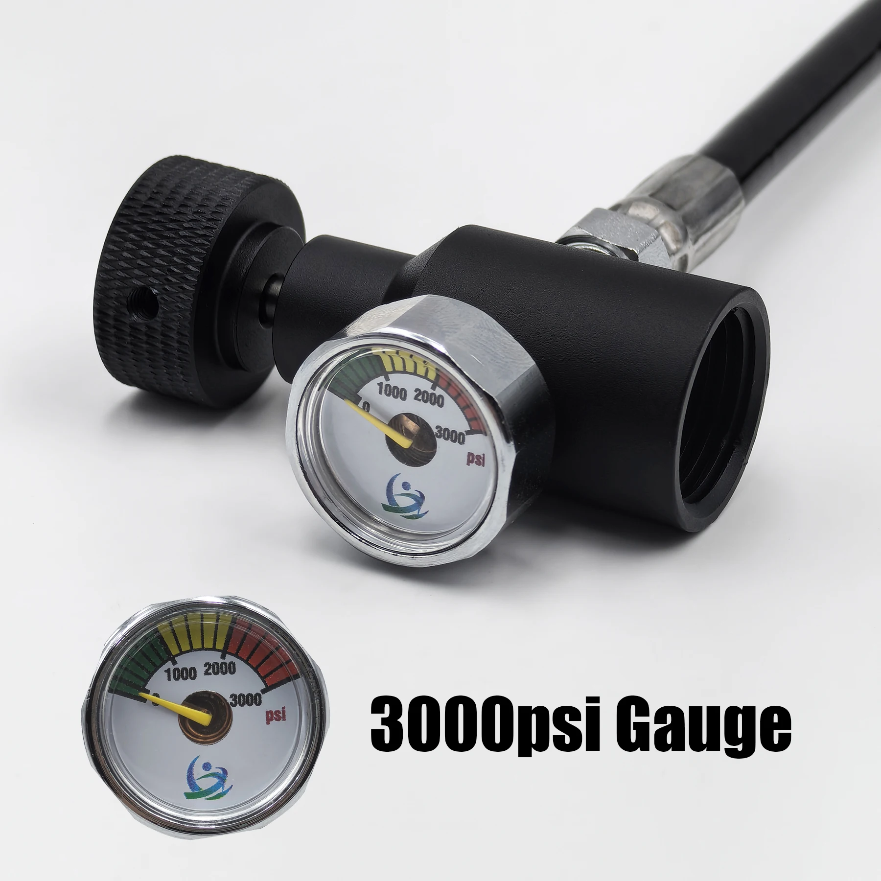 Puede elegir la especificación con un calibre de 3000 psi en un adaptador de llenado universal.Envíenos un mensaje o marcado en su pedido si desea cambiar el manómetro a 1500 psi o 2000 psi.