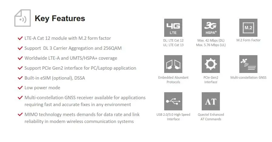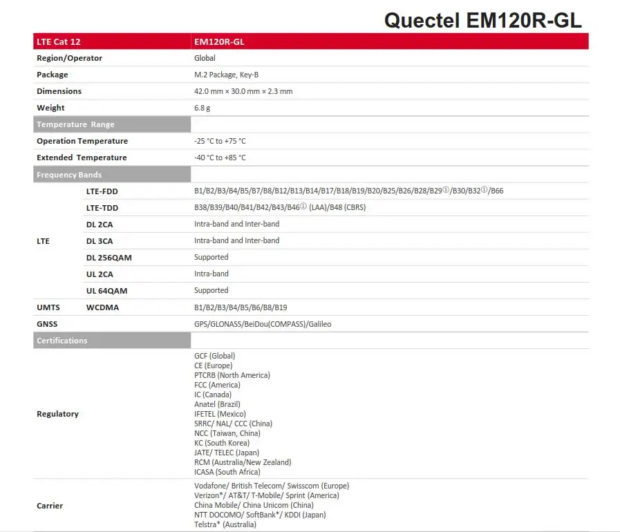 Especificaciones del módulo Quectel 4G LTE Cat12: