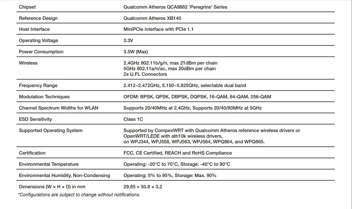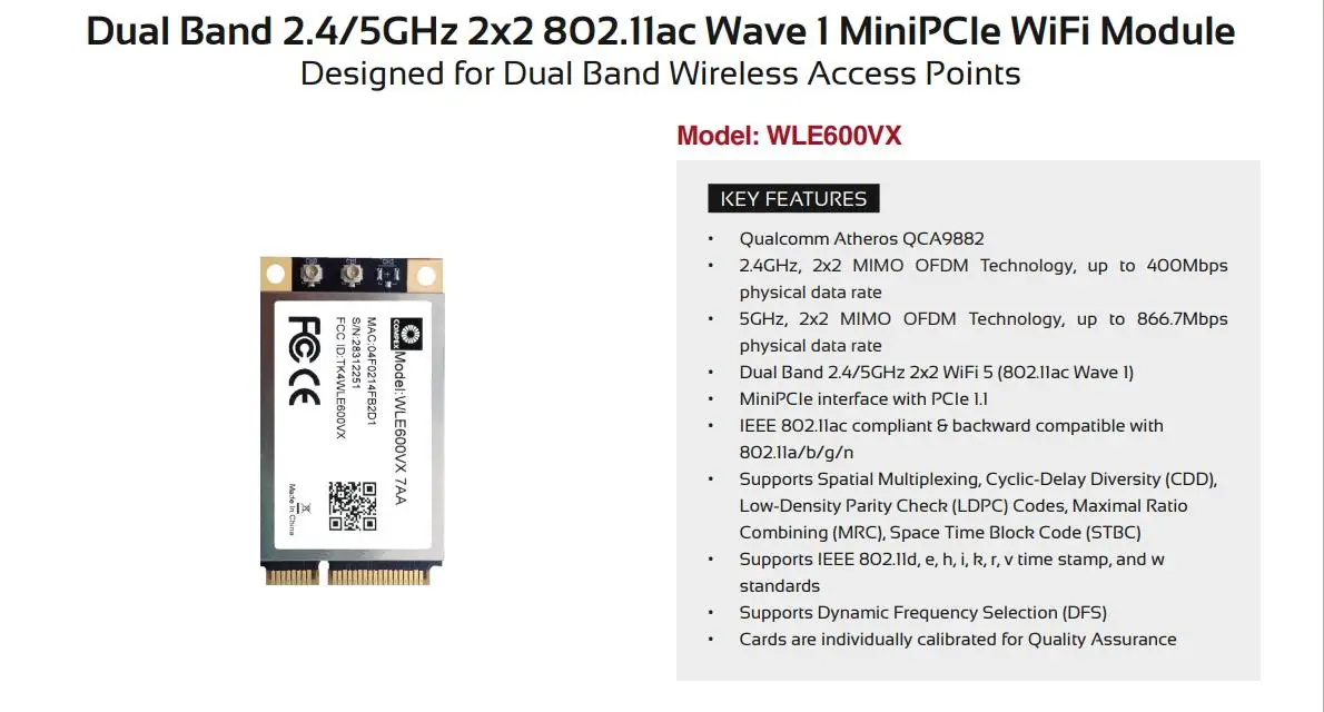 Soporta hasta 256 QAM, WLE600VX con su capacidad MIMO es una solución perfecta para aplicaciones o dispositivos empresariales, industriales, de ciberseguridad, de transporte y SMB. Con Compex actuando como un fabricante de valor agregado, y con la amplia experiencia de Compex con la unidad de código abierto ath10k y el controlador de código cerrado patentado de Qualcomm QSDK, WLE600VX no se limita a trabajar solo en el ecosistema de Qualcomm, sino también en plataformas de terceros como Intel x86 y otros procesadores ARM como NXP y Marvell.