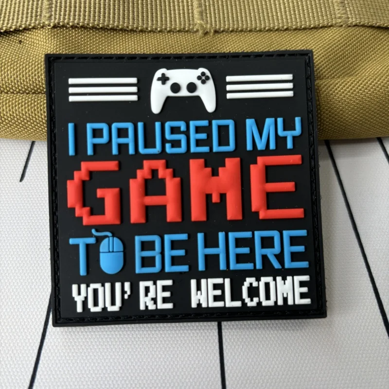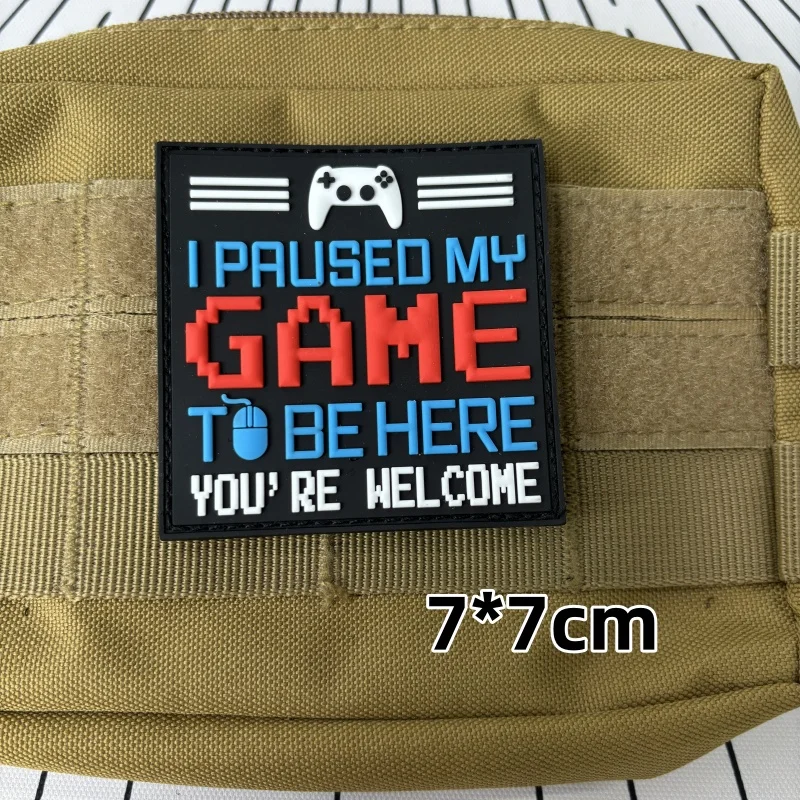 Hice una pausa en mi juego, parche táctico de PVC, emblema de gancho y bucle, divertido para estar aquí, eres bienvenido, insignia de moral, brazalete, pegatinas para mochilaNotas: