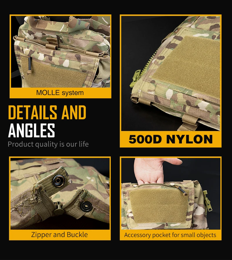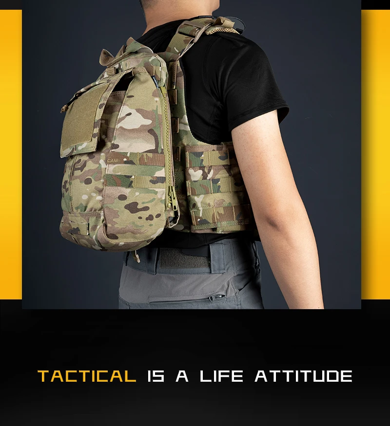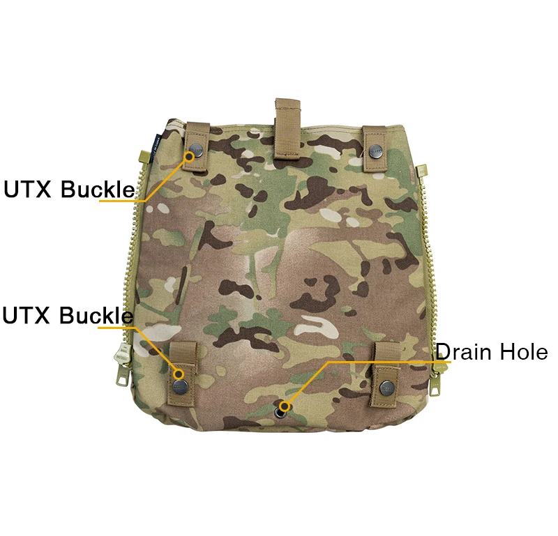 Se puede conectar al chaleco/soporte de placa a través de cremalleras y hebillas en la espalda