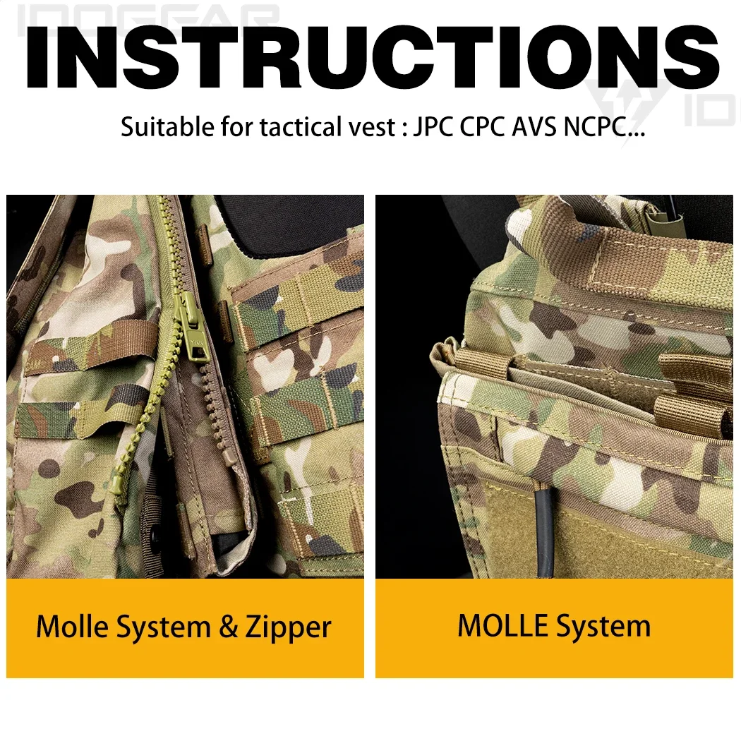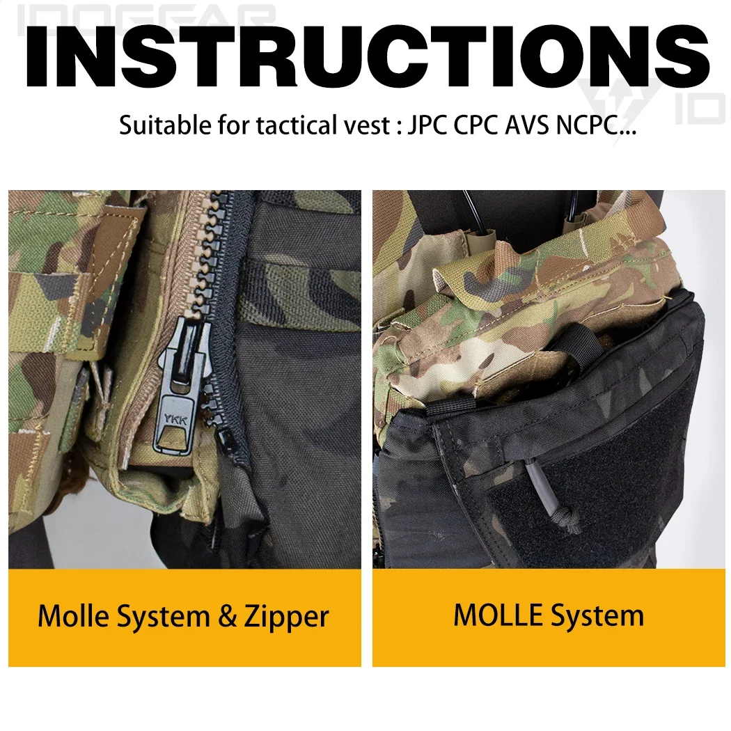 Accesorio seguro y versátil: Esta bolsa se puede sujetar de forma segura a su chaleco táctico de dos maneras.Puedes utilizar el sistema MOLLE solo o combinarlo con la cremallera, especialmente si tu chaleco táctico cuenta con un YKK.#10 cremalleras como los chalecos tácticos JPC 2.0, AVS o CPC.