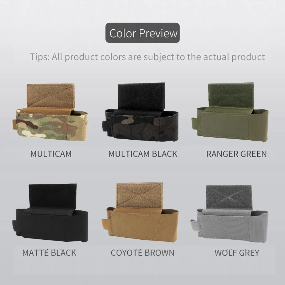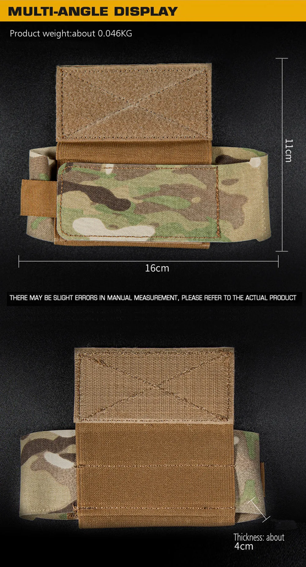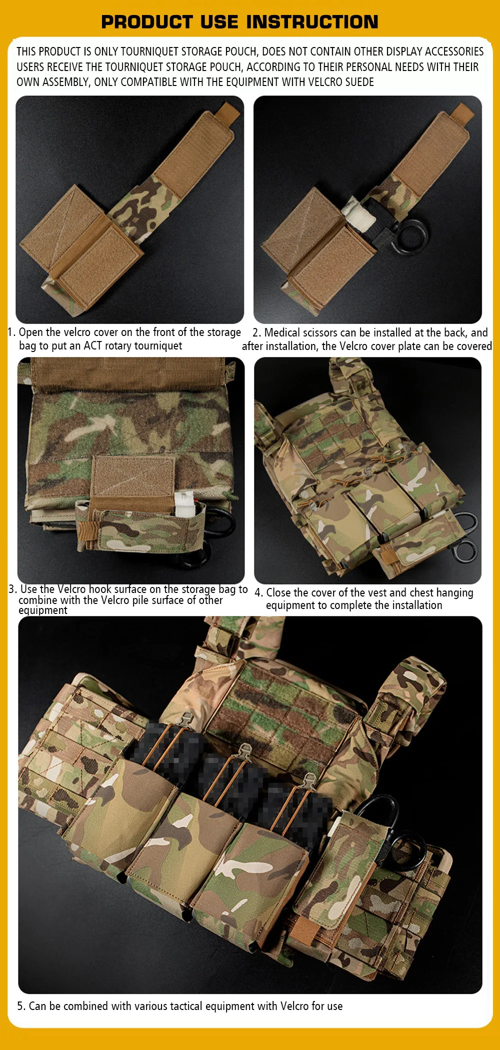 Nombre del producto: Bolsa de almacenamiento de torniquete N. ° de artículo: Tamaño del producto: 17*12*1,6 cm Peso neto del producto: 0.046KG Color del artículo: Negro mate/Coyote Brown/Ranger Green/Wolf Grey/Multicam/ MulticamBlack Material principal: tela Cordura
