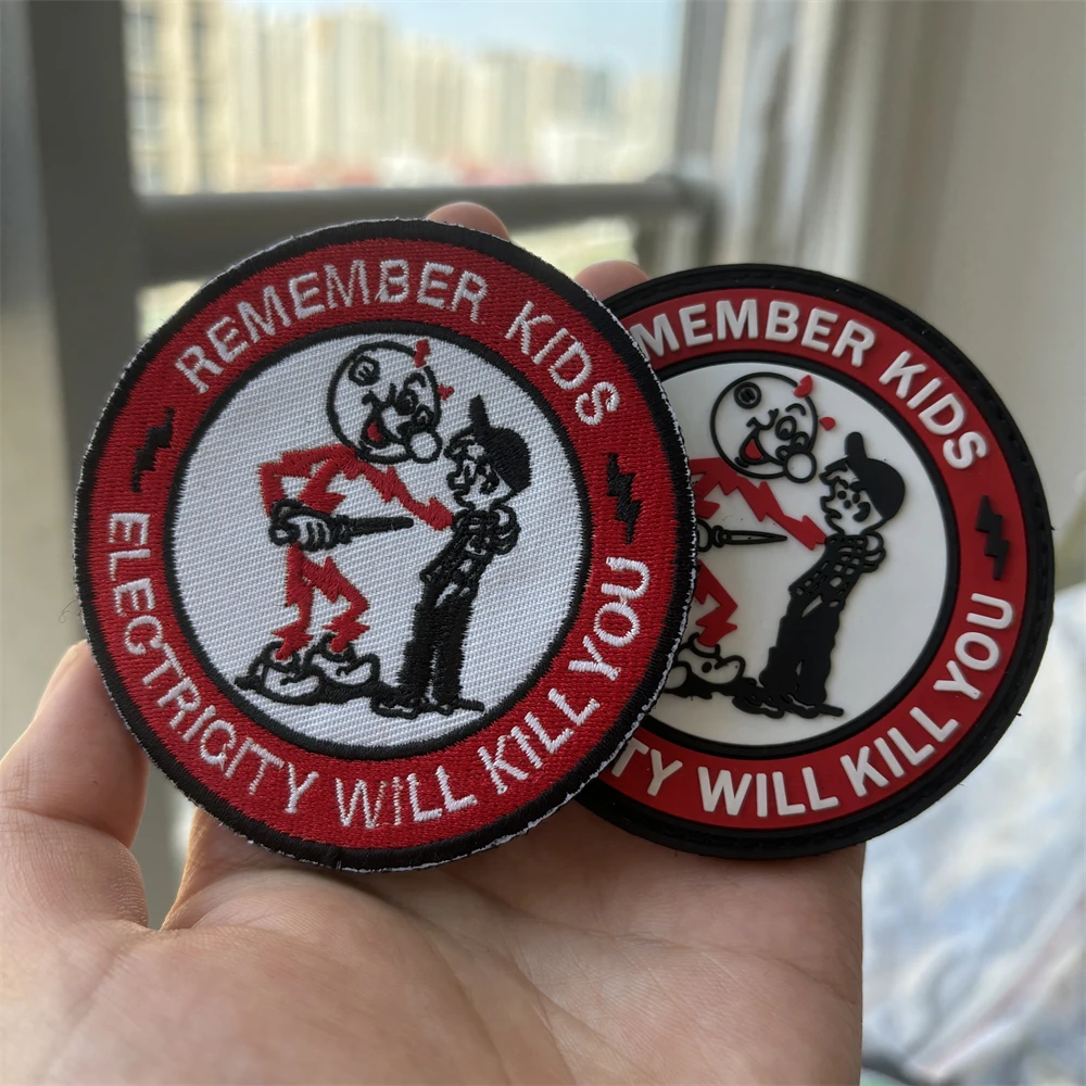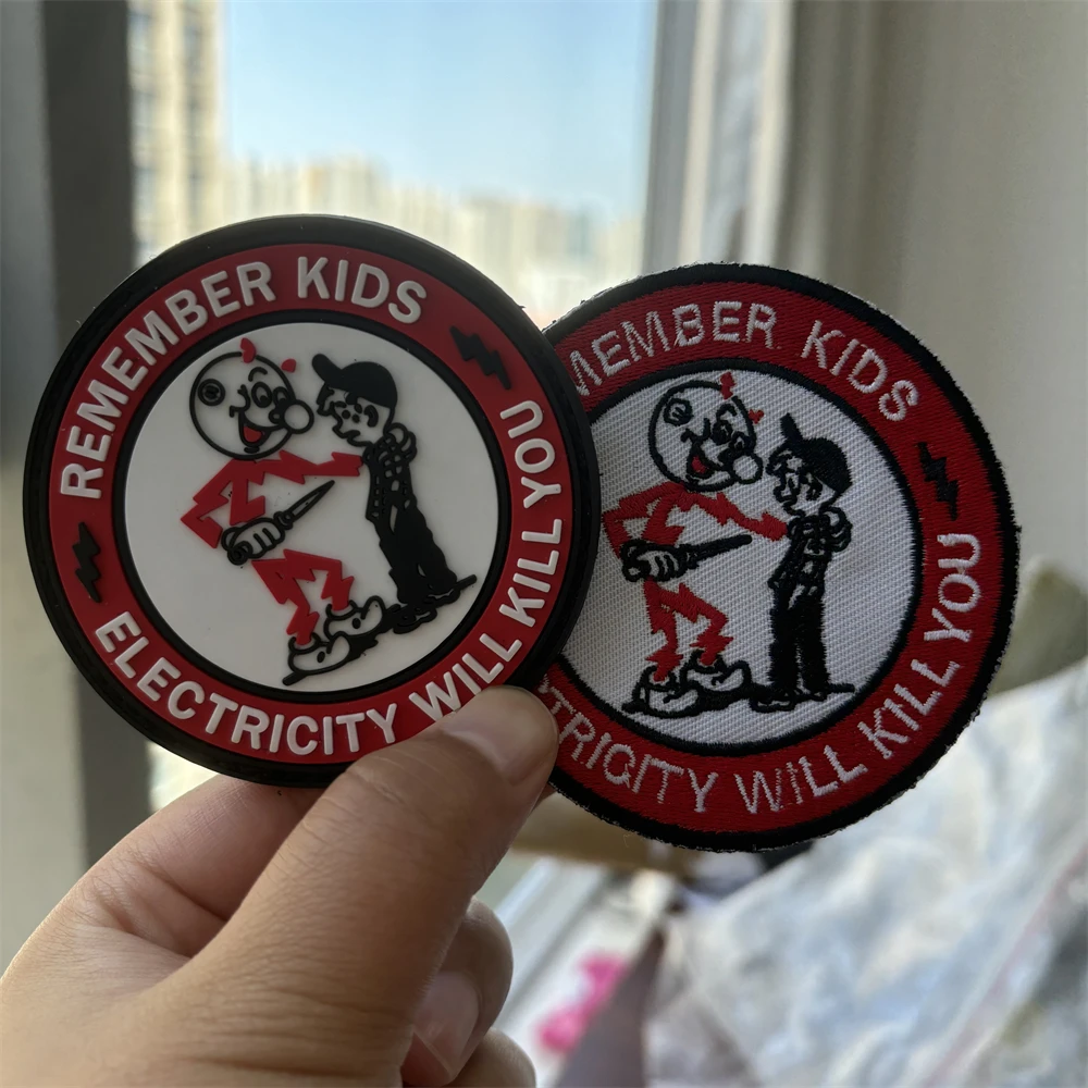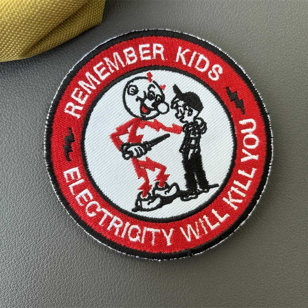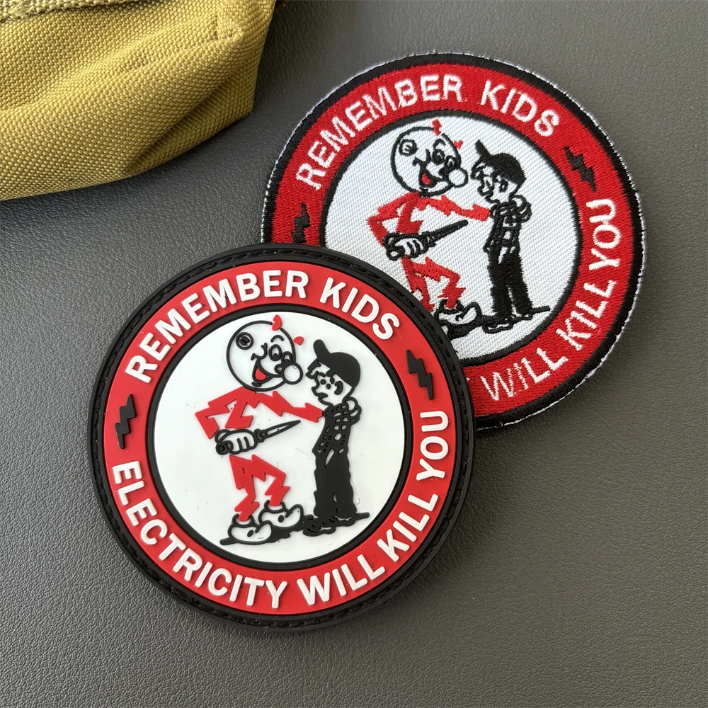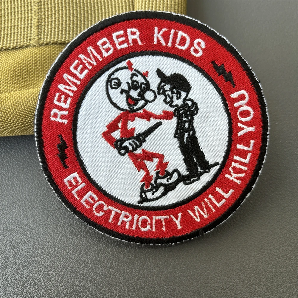 Recuerde que la electricidad de los niños lo matará, insignia bordada en la ropa, cierre de gancho y bucle, recordatorio, parches de advertencia, regalo para niñosNOTA: