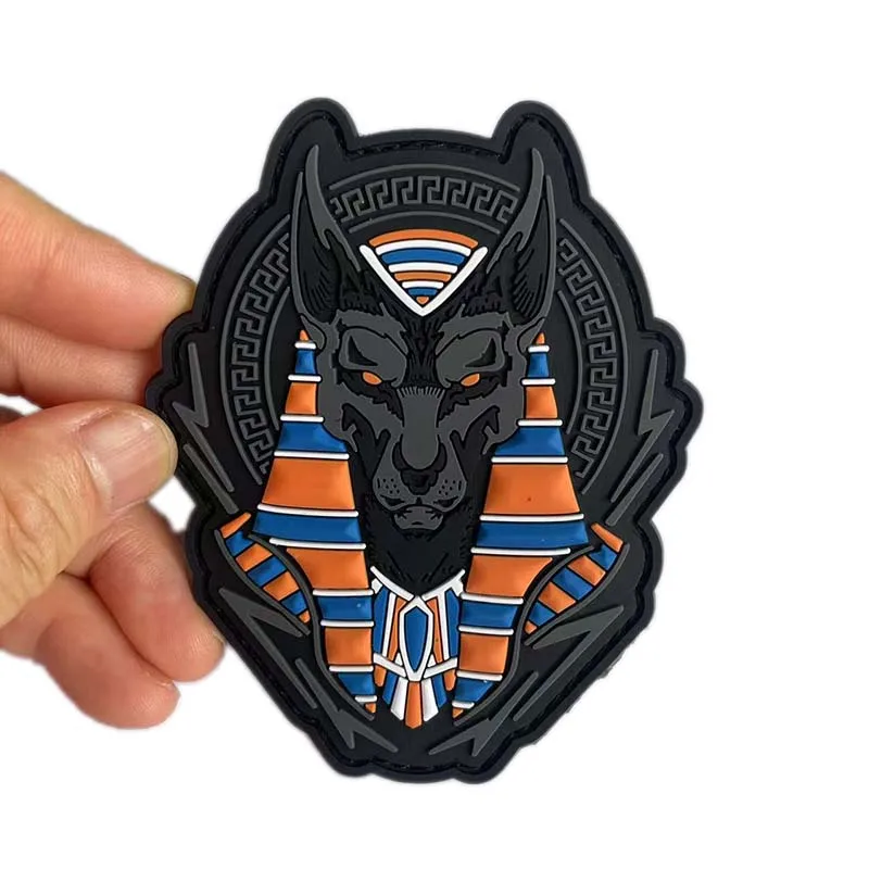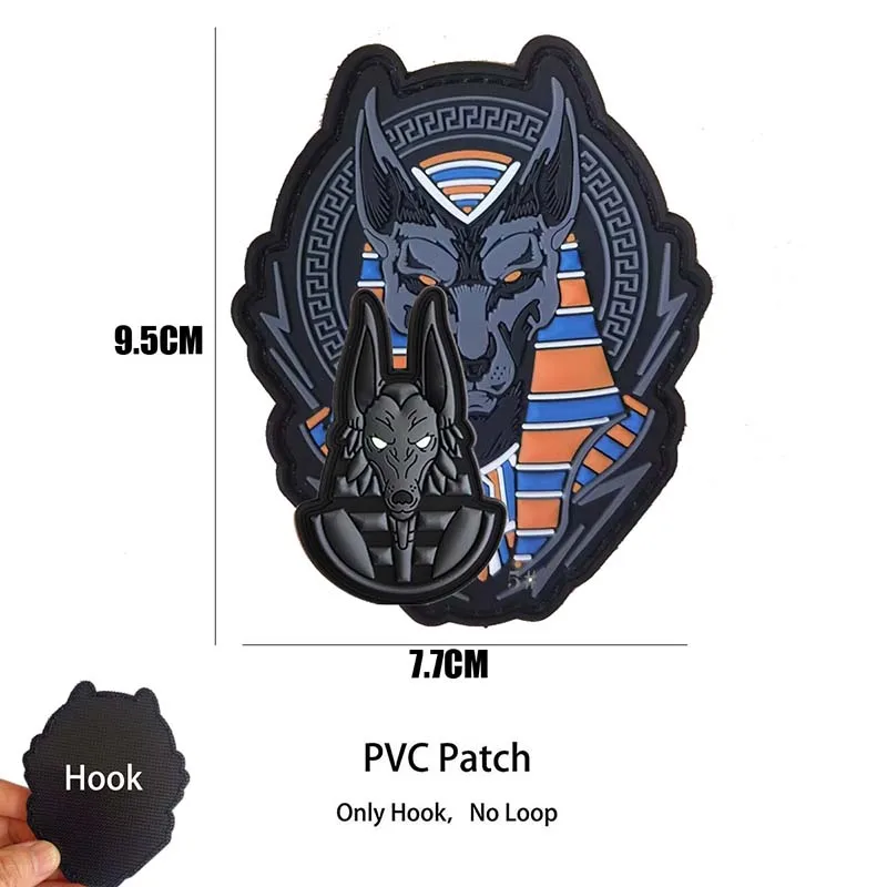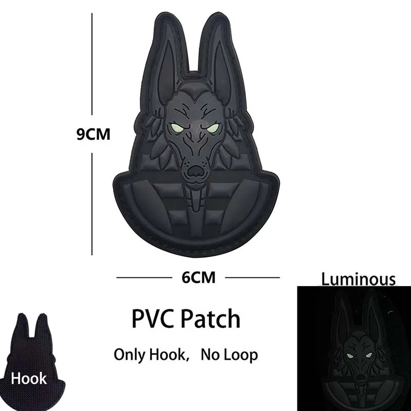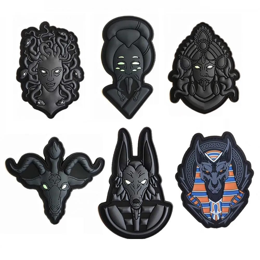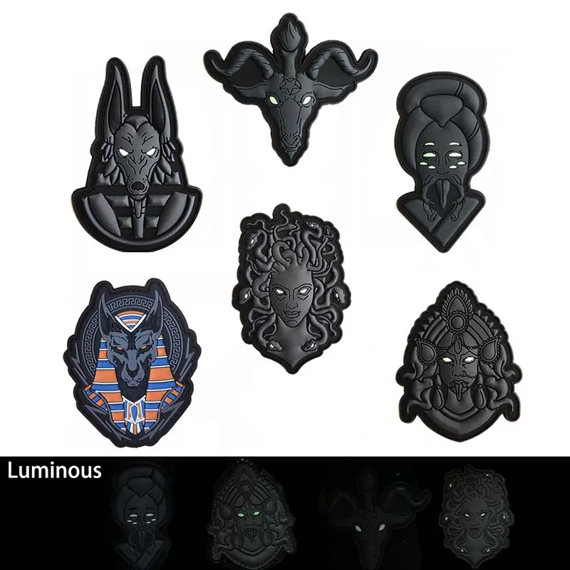 Insignia con logotipo de los mitos antiguos de Medusa, Anubis y Buffon que brilla en la oscuridad, apliques luminosos para mochila de PVC, parches morales con gancho