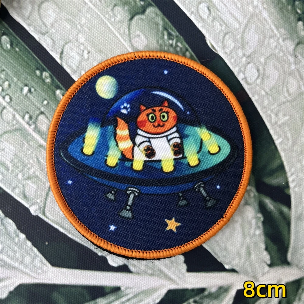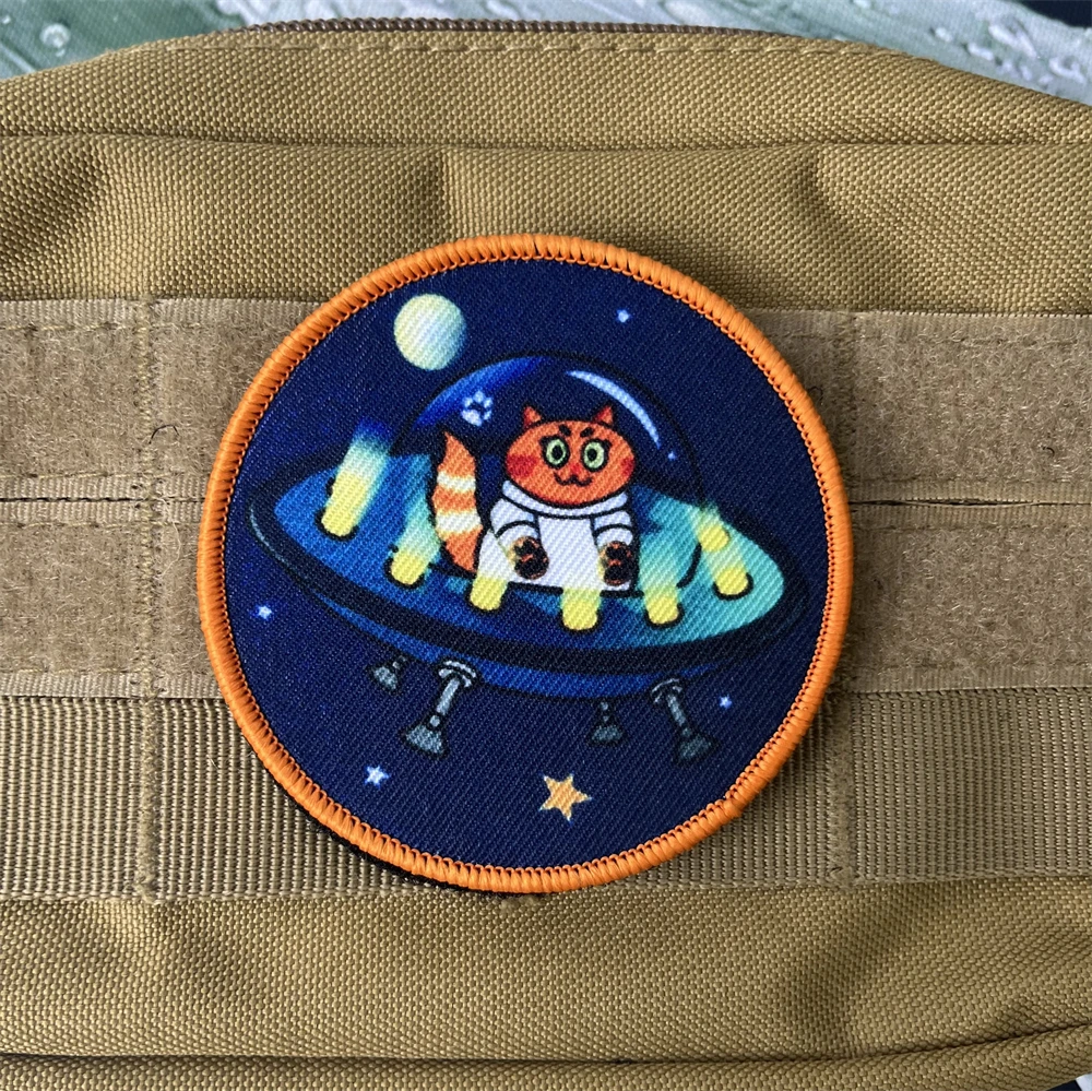 Gato siberiano Vojvodina astronauta en UFO Chevron insignia militar moral impreso gancho y bucle parche táctico mochila parches pegatinas