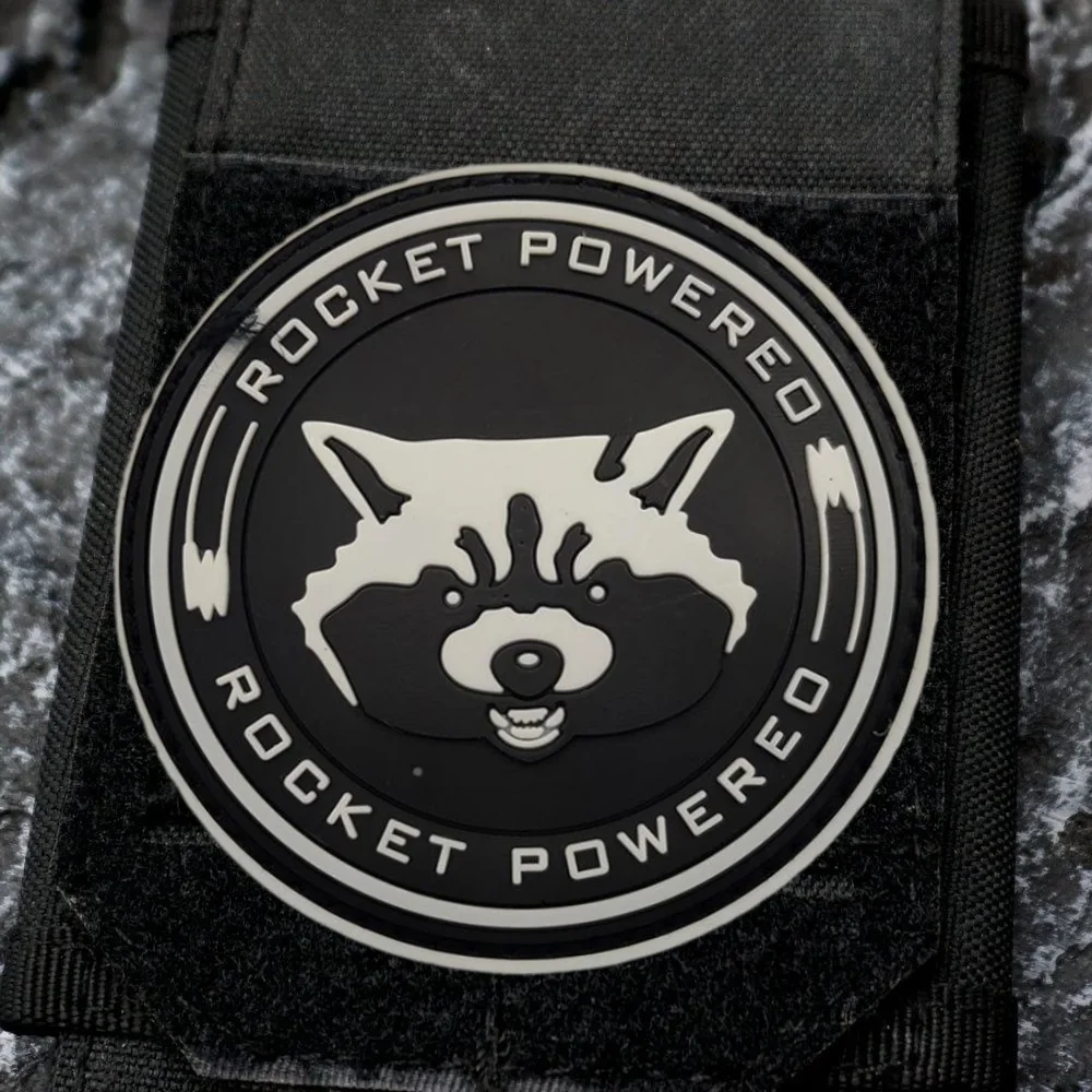 Insignia de moral alimentada por cohete de dibujos animados, parche de PVC, cabeza de mapache luminosa táctica, gancho militar y bucle, mochila, sombrero, accesorios, pegatina