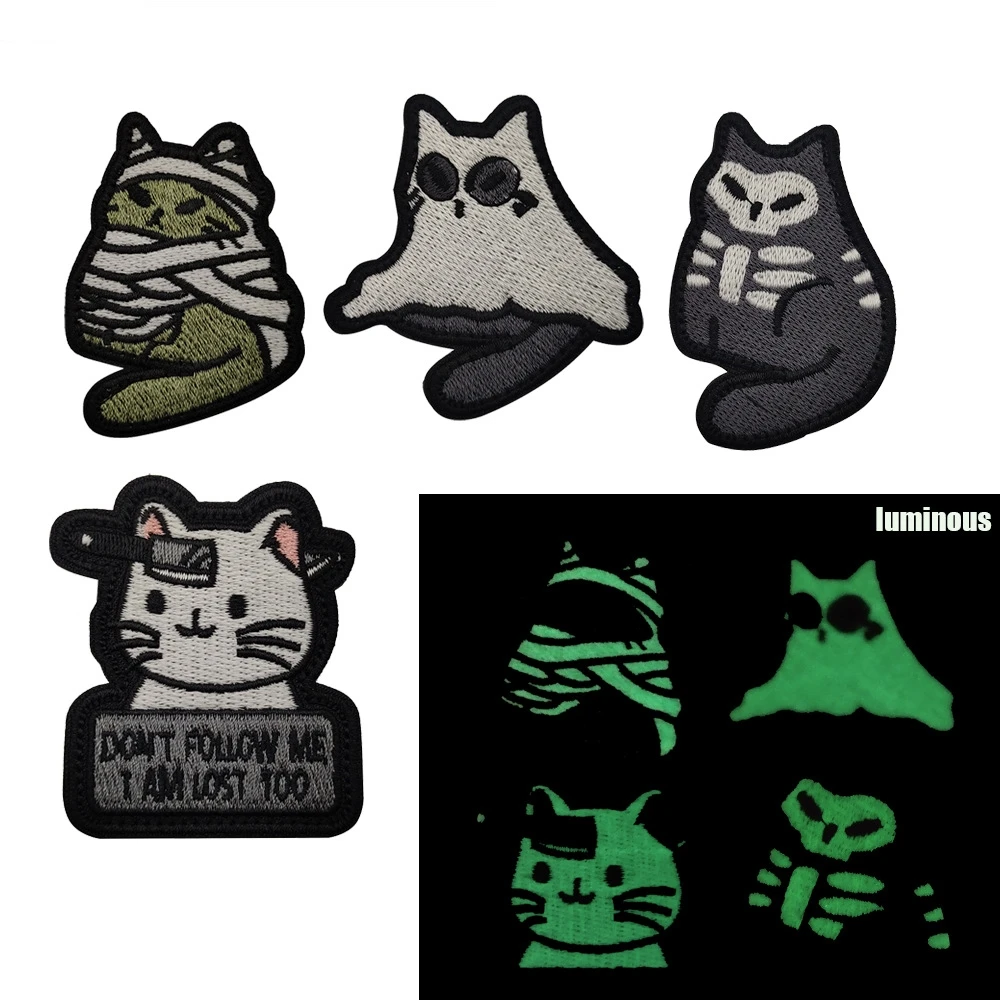 Halloween Night Glow Cat Morale Badge Tactical Hook&Loop Patches Cartoon Embroidery Armband Backpack Decoration Sticker