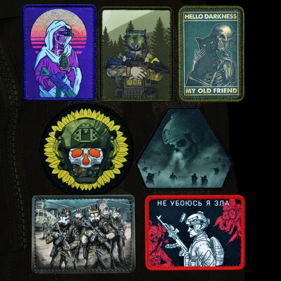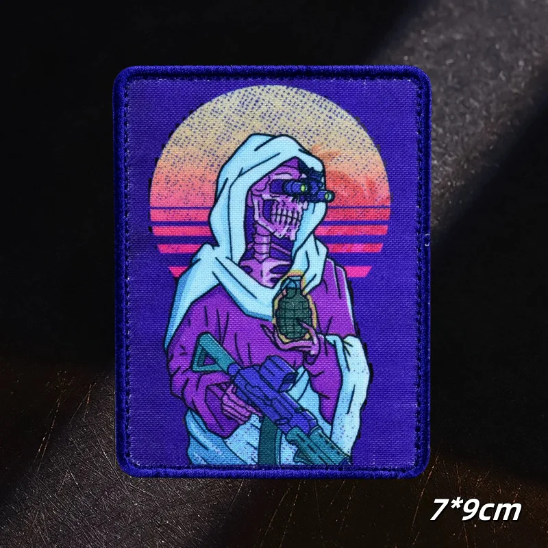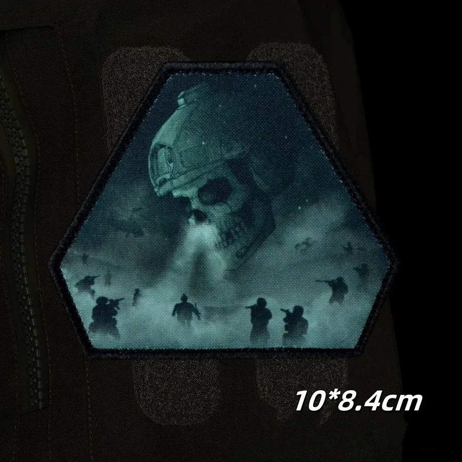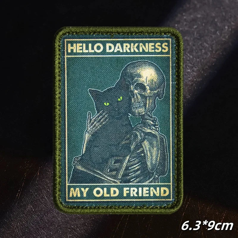 Insignia de moral guerrero con calavera antiniebla, insignia divertida "Hola oscuridad, mi viejo amigo", parches de esqueleto, brazalete militar Klett Chevron para mochilaNotas: