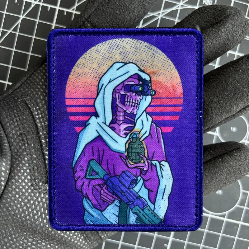 "Retro Death" Insignia de moral FOG Esqueleto Impresión Parches de gancho y bucle Klett Punk Skull Parche táctico Pegatinas de mochila militar