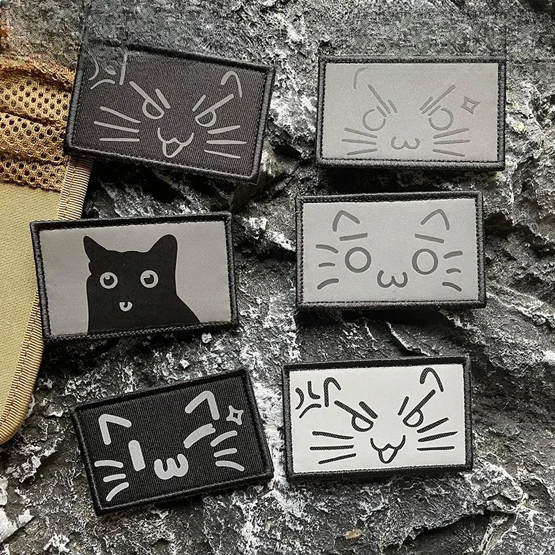 Insignia de moral de expresión de gato lindo reflectante en la mochila, parche de gancho y bucle, parches tácticos de Panda de dibujos animados para ropa, brazalete
